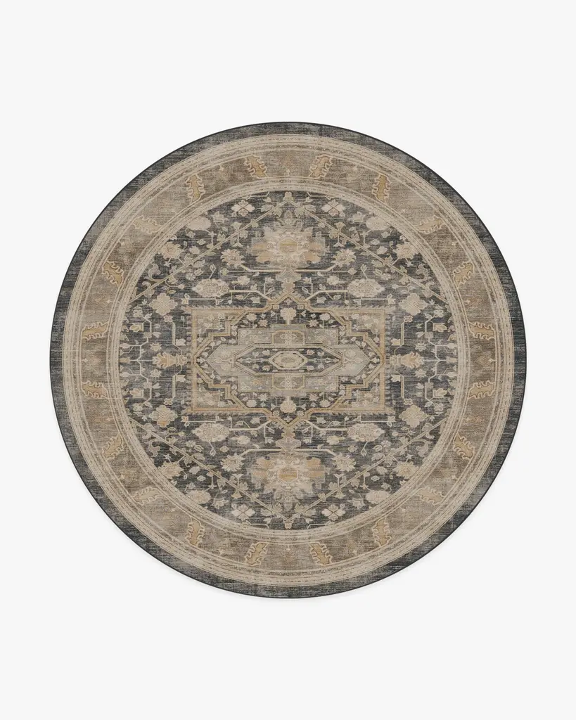 A Persian design with a distressed look. Inspired by traditional Heriz rugs, this design features a large medallion with an ornate border in rich shades of vintage red, navy, and gold. Water-resistant, stain-resistant, and machine-washable.