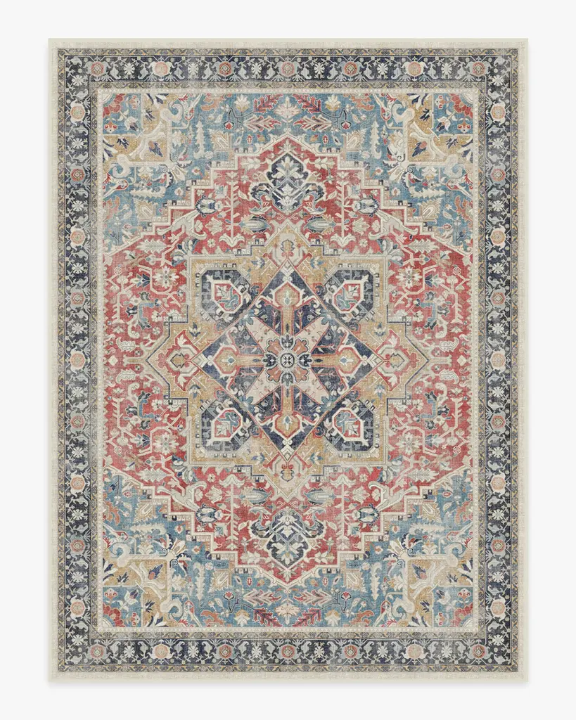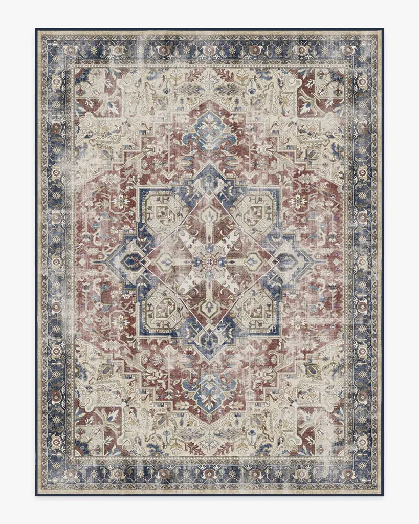 A Persian design with a distressed look. Inspired by traditional Heriz rugs, this design features a large medallion with an ornate border in rich shades of vintage red, navy, and gold. Water-resistant, stain-resistant, and machine-washable.