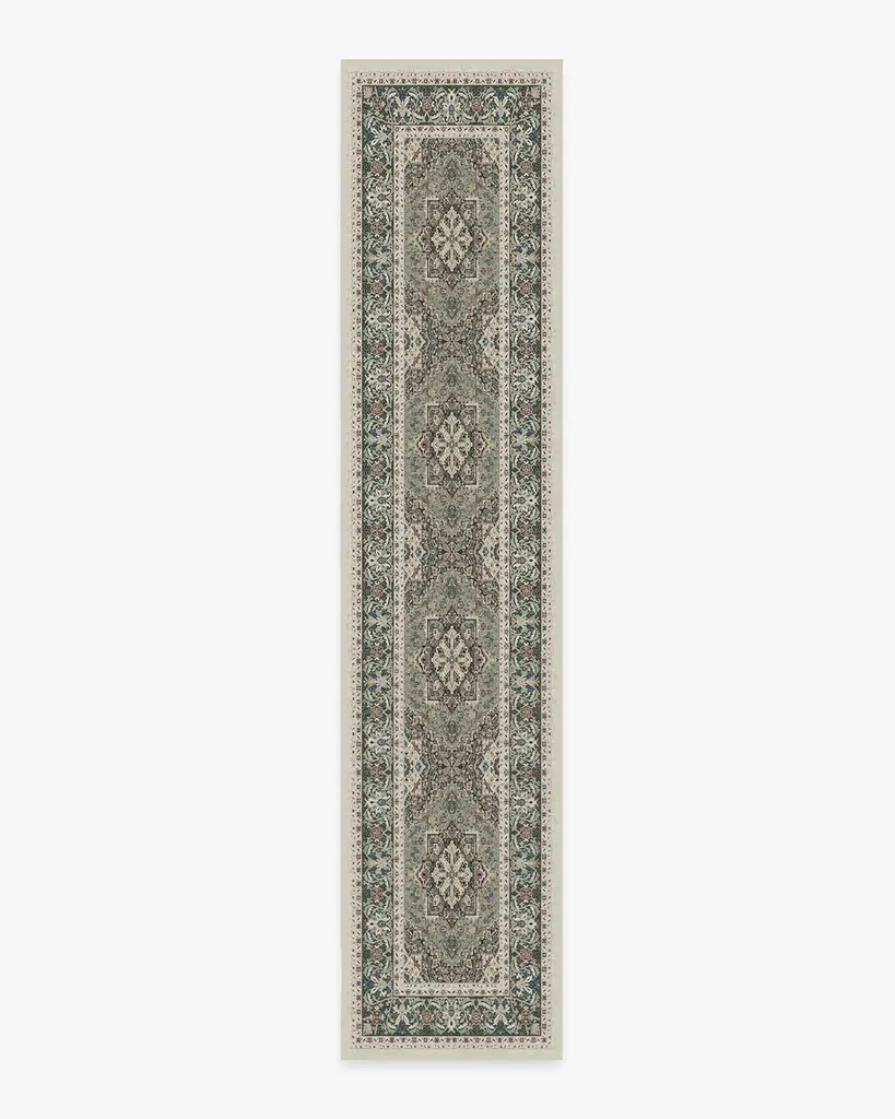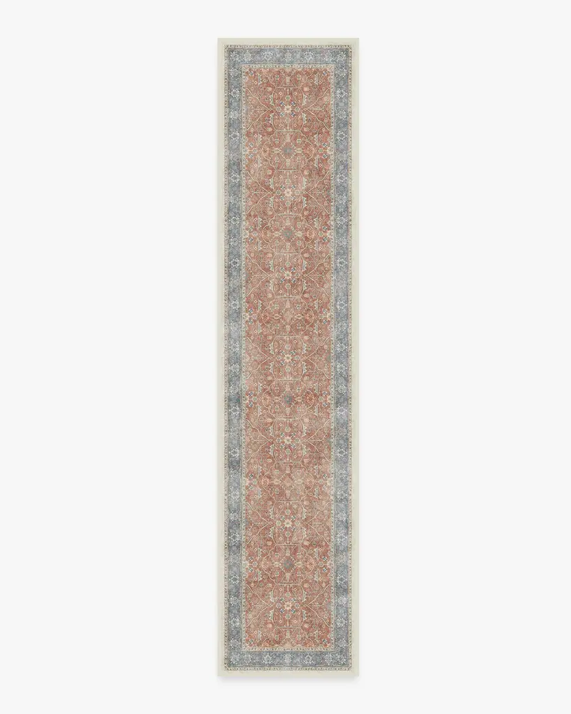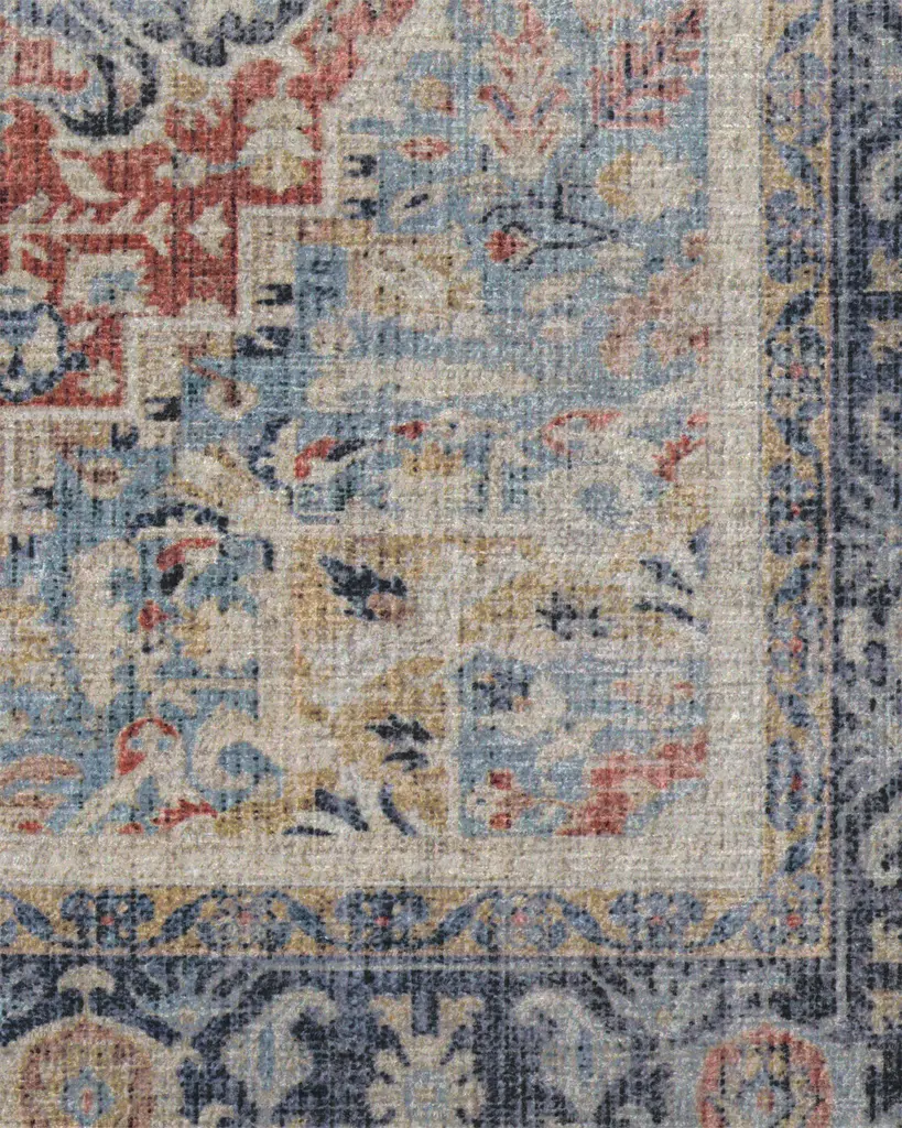 A Persian design with a distressed look. Inspired by traditional Heriz rugs, this design features a large medallion with an ornate border in rich shades of vintage red, navy, and gold. Water-resistant, stain-resistant, and machine-washable.