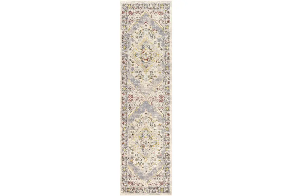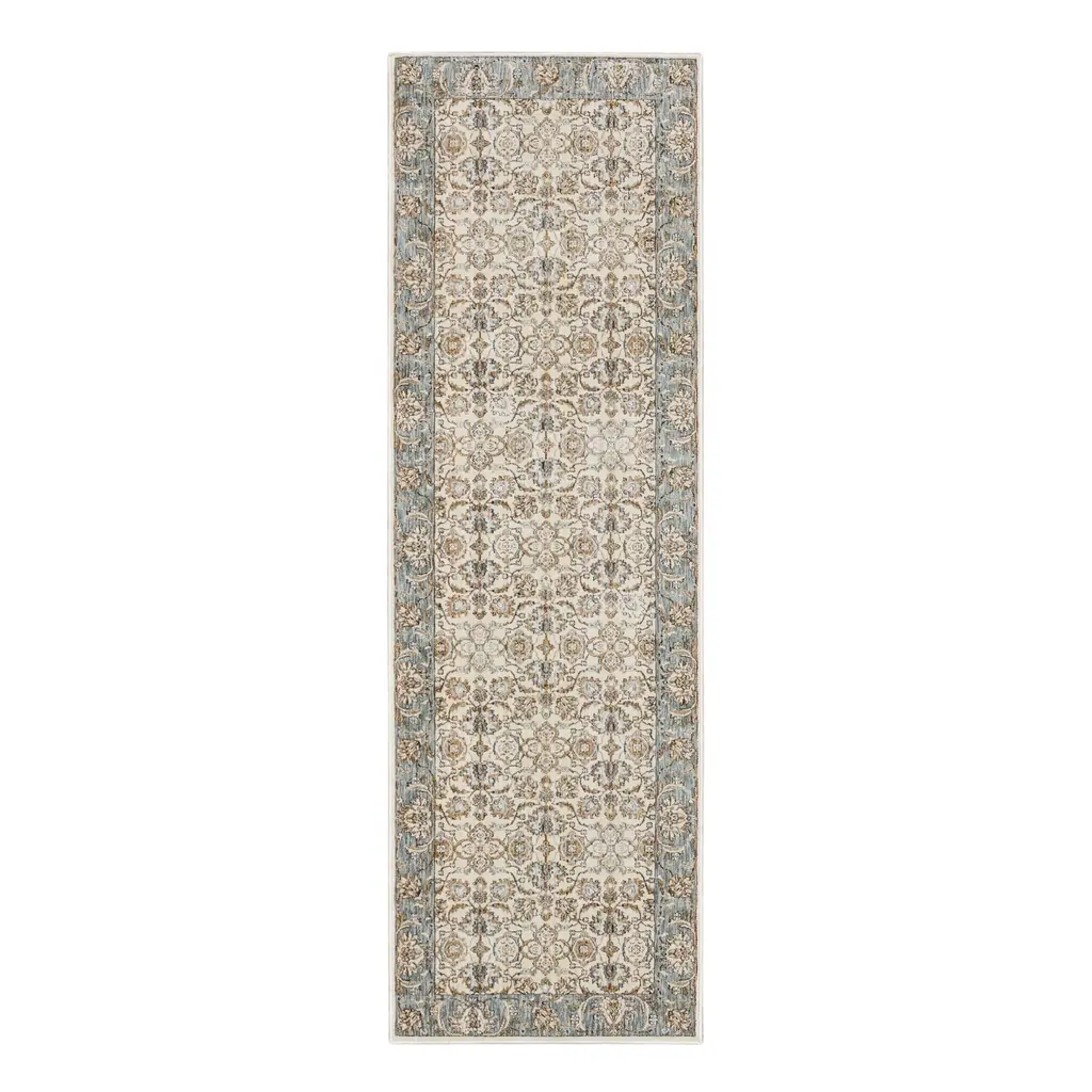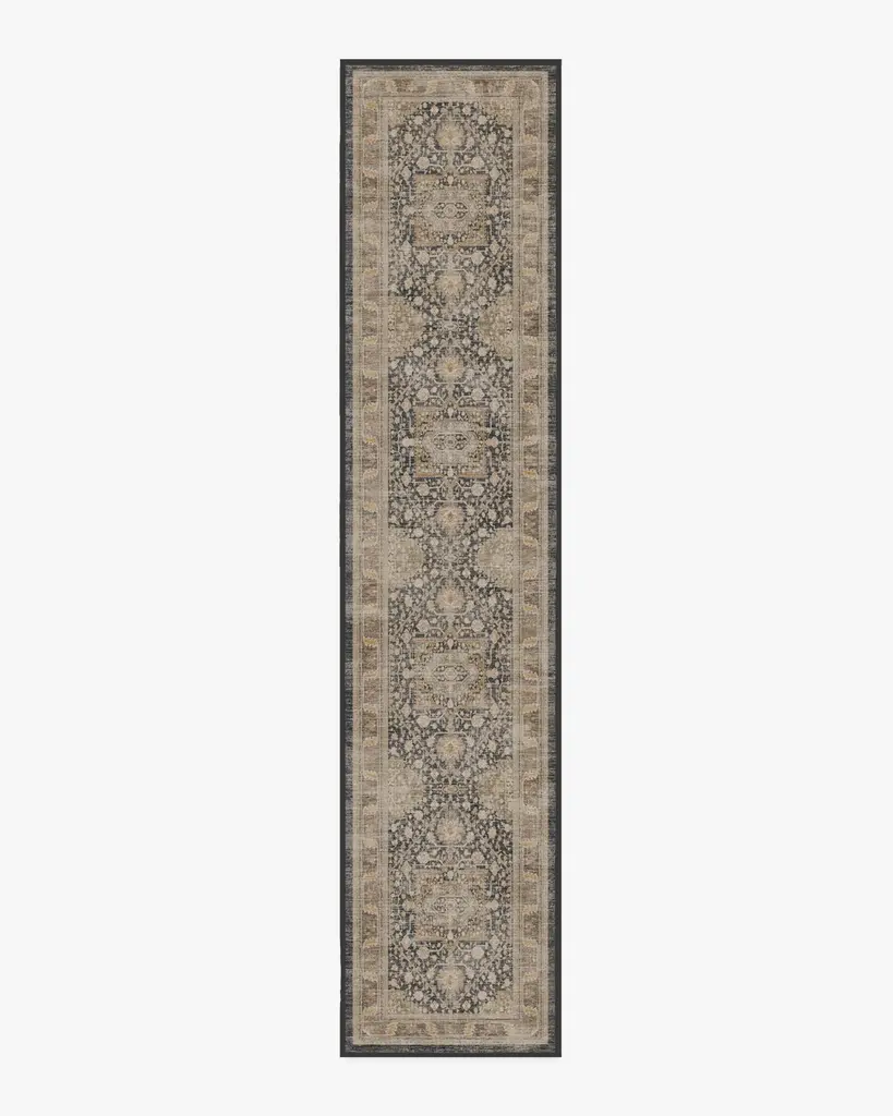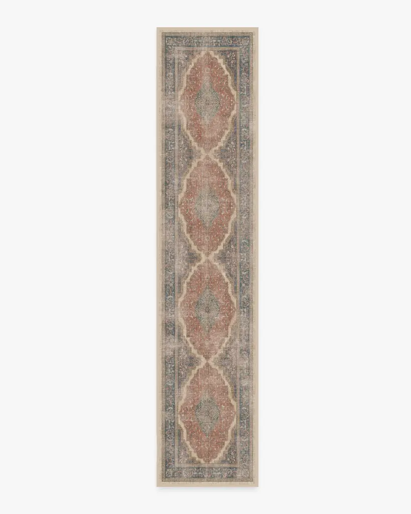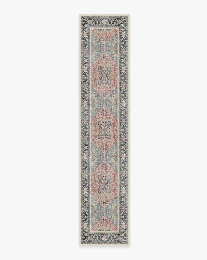 A Persian design with a distressed look. Inspired by traditional Heriz rugs, this design features a large medallion with an ornate border in rich shades of vintage red, navy, and gold. Water-resistant, stain-resistant, and machine-washable.
