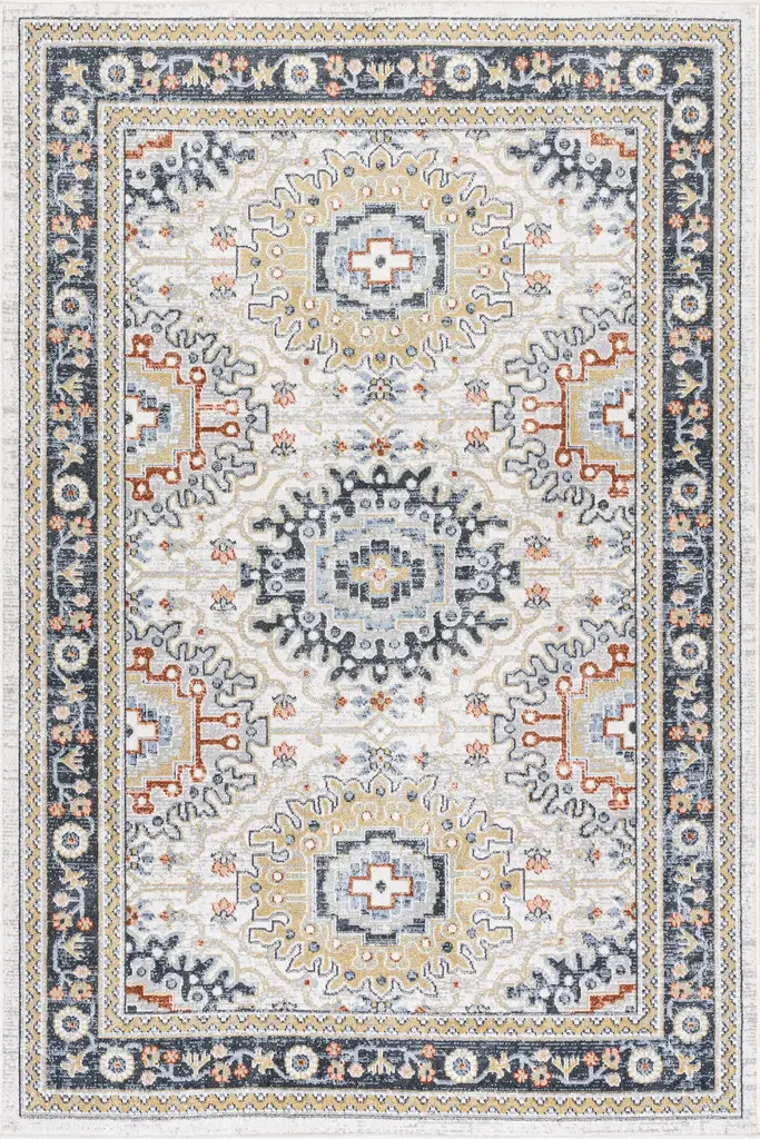 A Persian design with a distressed look. Inspired by traditional Heriz rugs, this design features a large medallion with an ornate border in rich shades of vintage red, navy, and gold. Water-resistant, stain-resistant, and machine-washable.