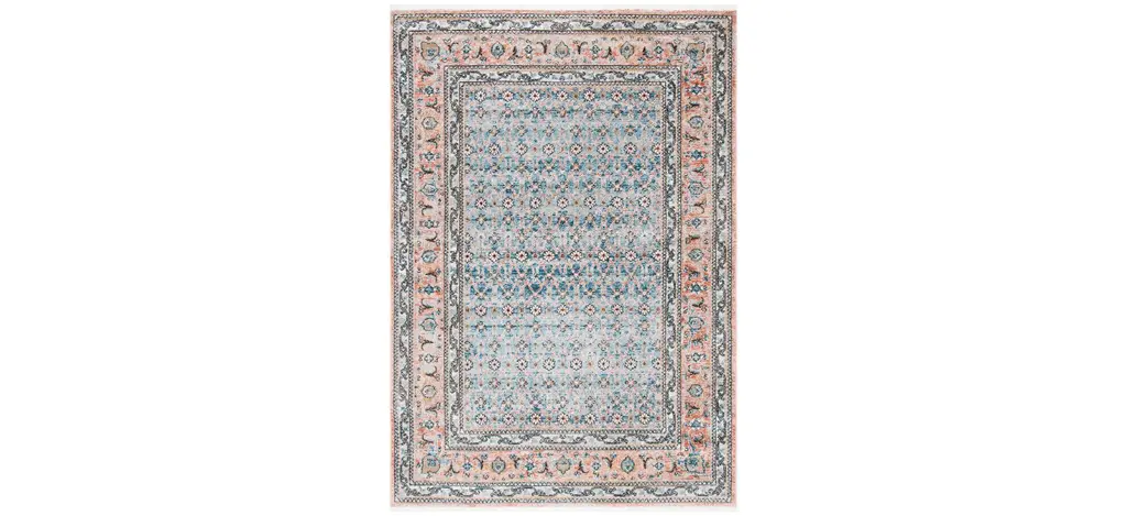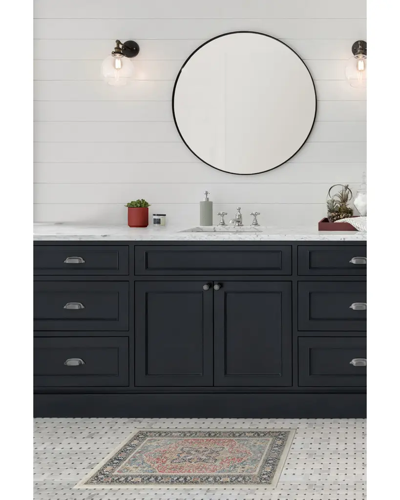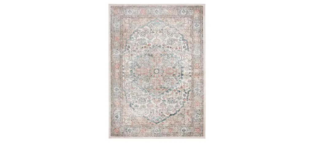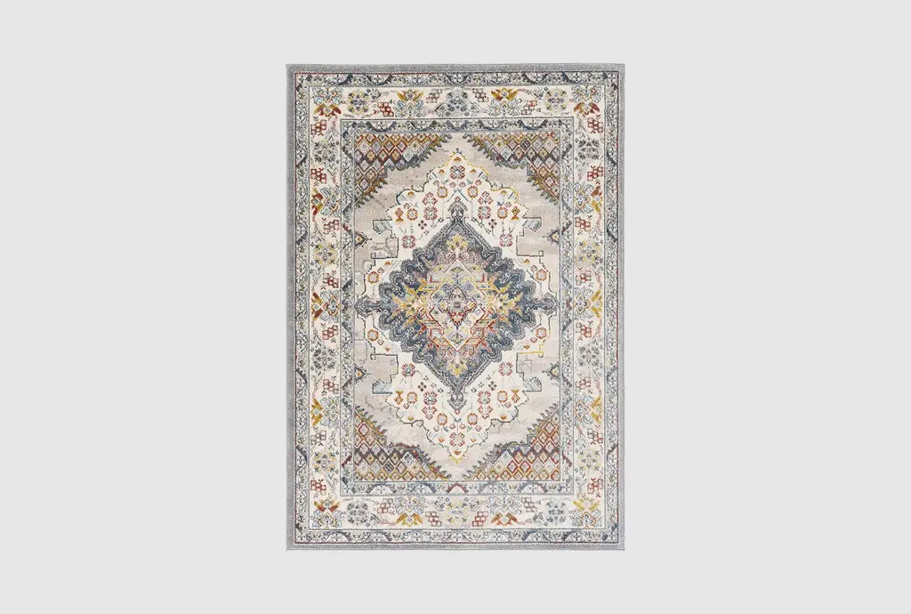 A Persian design with a distressed look. Inspired by traditional Heriz rugs, this design features a large medallion with an ornate border in rich shades of vintage red, navy, and gold. Water-resistant, stain-resistant, and machine-washable.