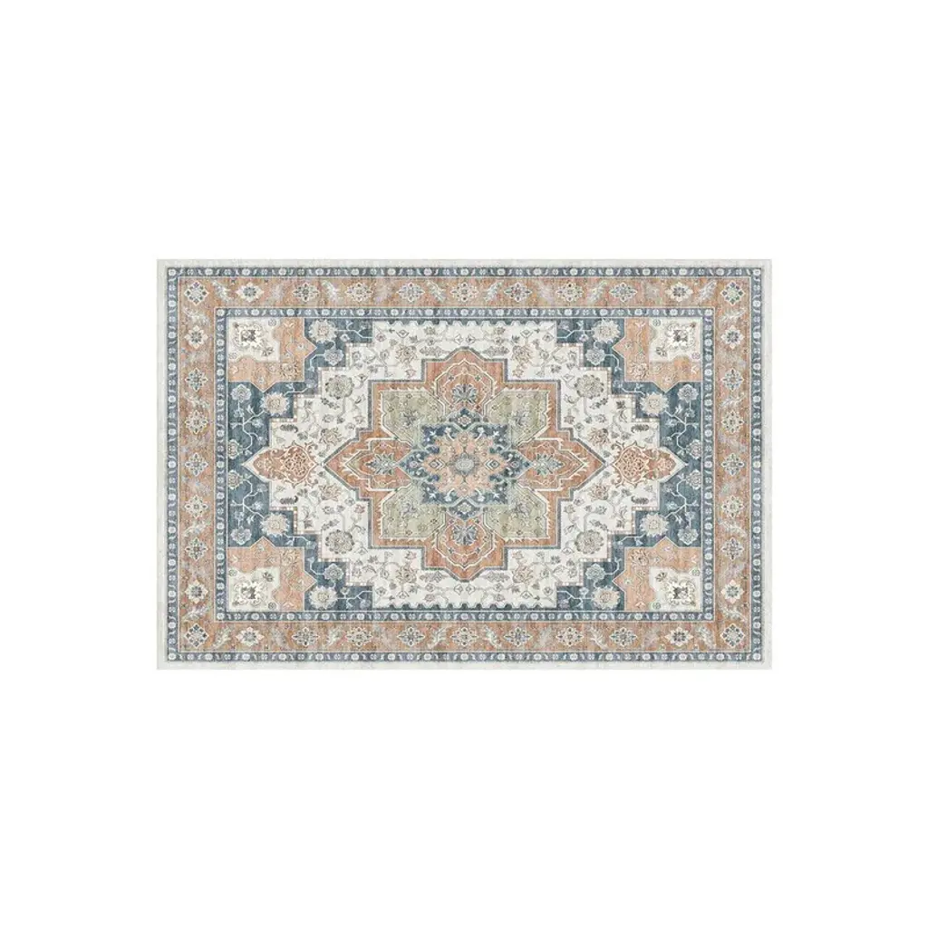 A Persian design with a distressed look. Inspired by traditional Heriz rugs, this design features a large medallion with an ornate border in rich shades of vintage red, navy, and gold. Water-resistant, stain-resistant, and machine-washable.