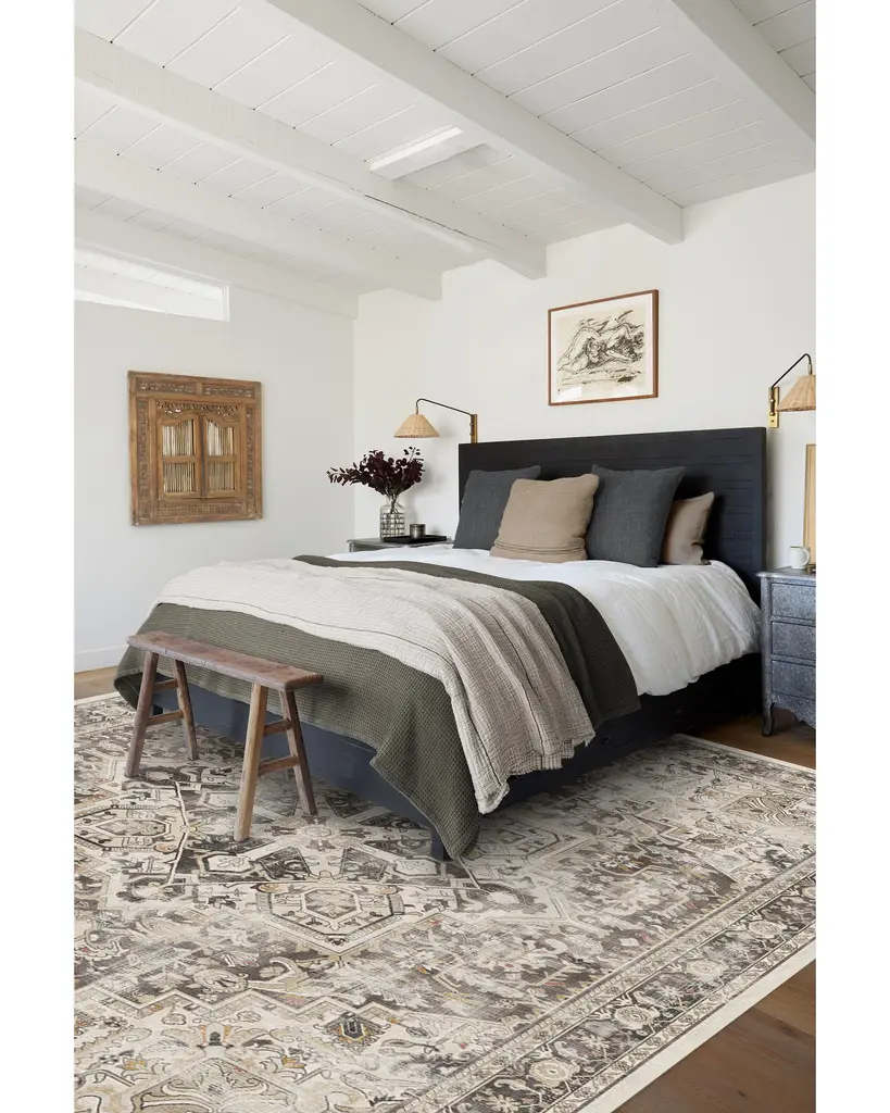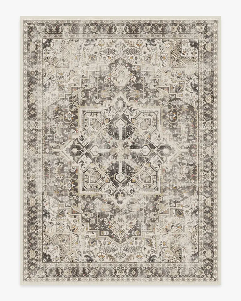 Kamran Hazel Rug gives a classic Persian design a farmhouse appeal. Like a traditional Heriz rug, this rug features a large central medallion with an ornate border. It's tinted in rich browns, honey, gold, and creams, purposefully distressed to create a warm and rustic vibe.