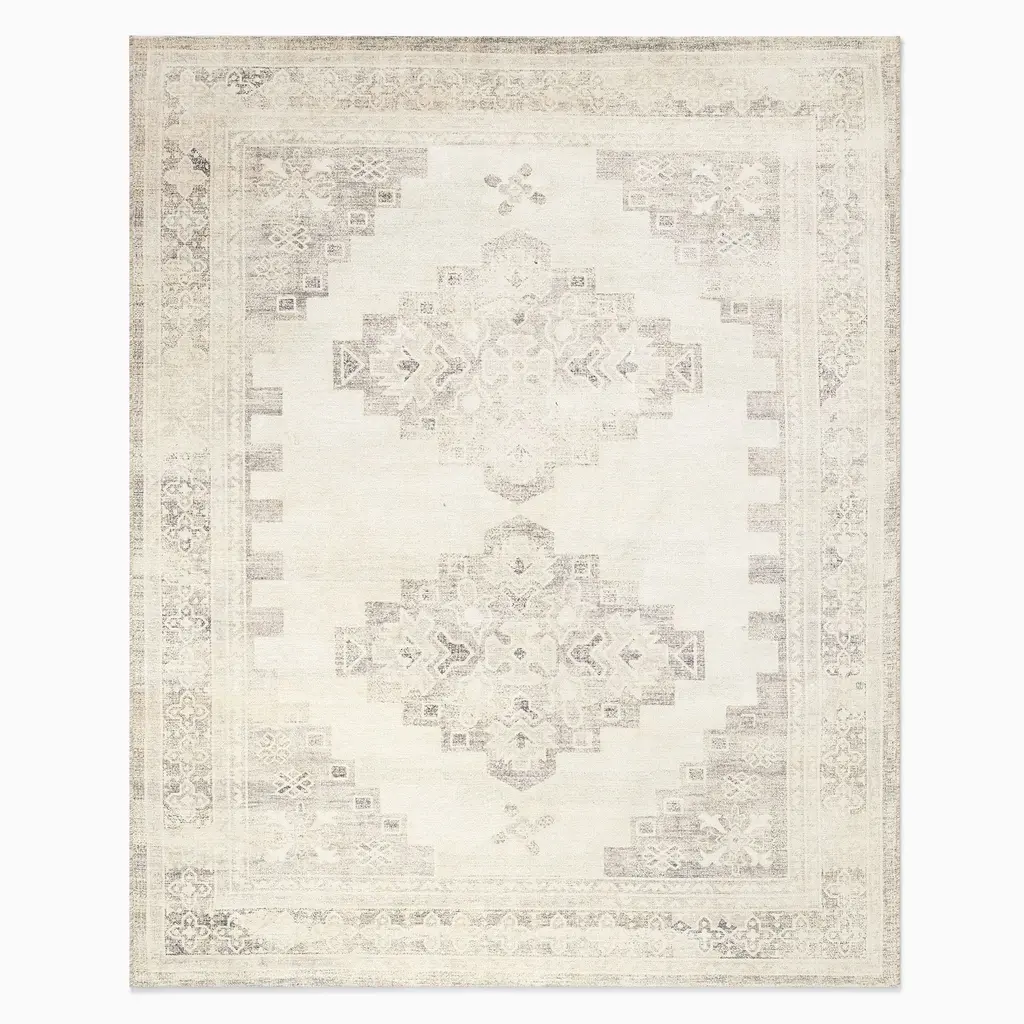 Kamran Hazel Rug gives a classic Persian design a farmhouse appeal. Like a traditional Heriz rug, this rug features a large central medallion with an ornate border. It's tinted in rich browns, honey, gold, and creams, purposefully distressed to create a warm and rustic vibe.