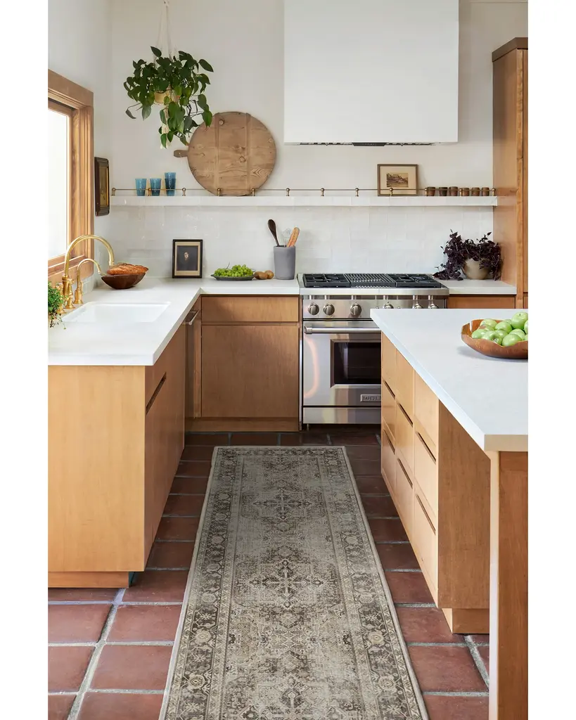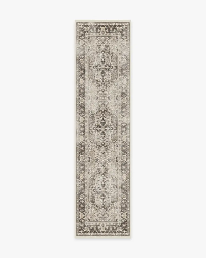 Kamran Hazel Rug gives a classic Persian design a farmhouse appeal. Like a traditional Heriz rug, this rug features a large central medallion with an ornate border. It's tinted in rich browns, honey, gold, and creams, purposefully distressed to create a warm and rustic vibe.