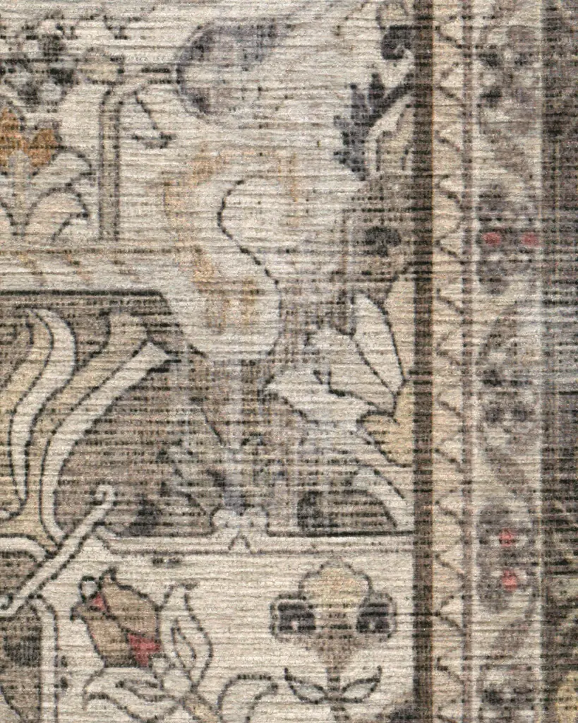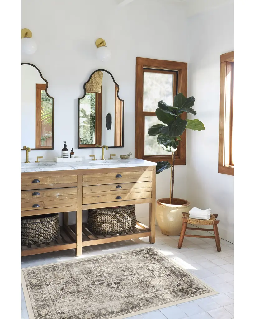 Kamran Hazel Rug gives a classic Persian design a farmhouse appeal. Like a traditional Heriz rug, this rug features a large central medallion with an ornate border. It's tinted in rich browns, honey, gold, and creams, purposefully distressed to create a warm and rustic vibe. Water-resistant, stain-resistant, and machine-washable.