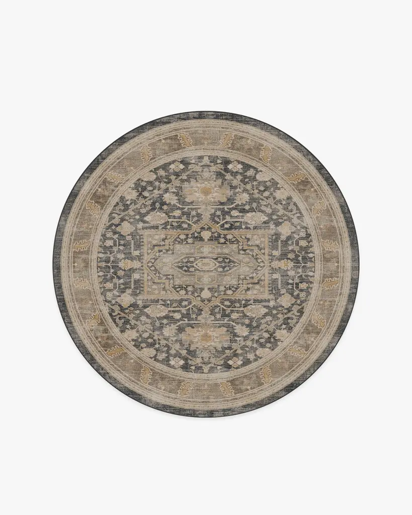 Kamran Hazel Rug gives a classic Persian design a farmhouse appeal. Like a traditional Heriz rug, this rug features a large central medallion with an ornate border. It's tinted in rich browns, honey, gold, and creams, purposefully distressed to create a warm and rustic vibe.