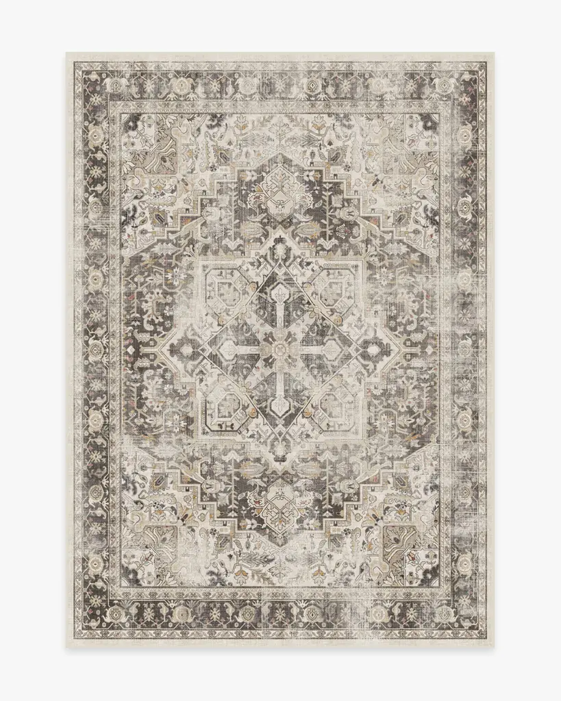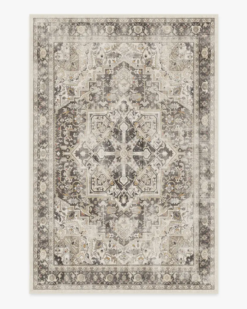 Kamran Hazel Rug gives a classic Persian design a farmhouse appeal. Like a traditional Heriz rug, this rug features a large central medallion with an ornate border. It's tinted in rich browns, honey, gold, and creams, purposefully distressed to create a warm and rustic vibe. Water-resistant, stain-resistant, and machine-washable.
