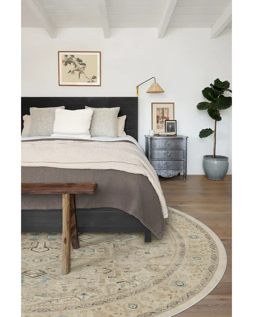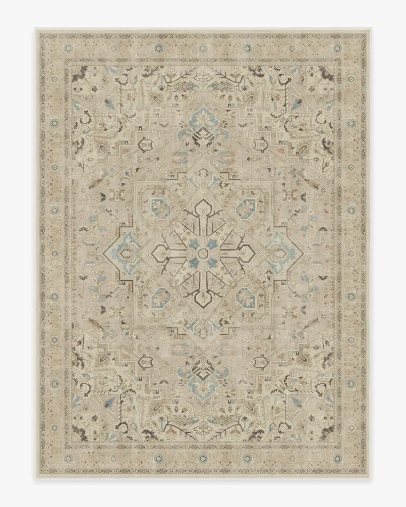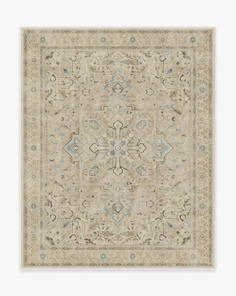 A minimalist take on a classic Persian design. Our Kamran Ivory Opal Rug features a large medallion and ornate border inspired by traditional Heriz rugs, but in an updated neutral color palette. Shades of ivory are accented with dark brown and hints of light blue and coral. Water-resistant, stain-resistant, and machine-washable.
