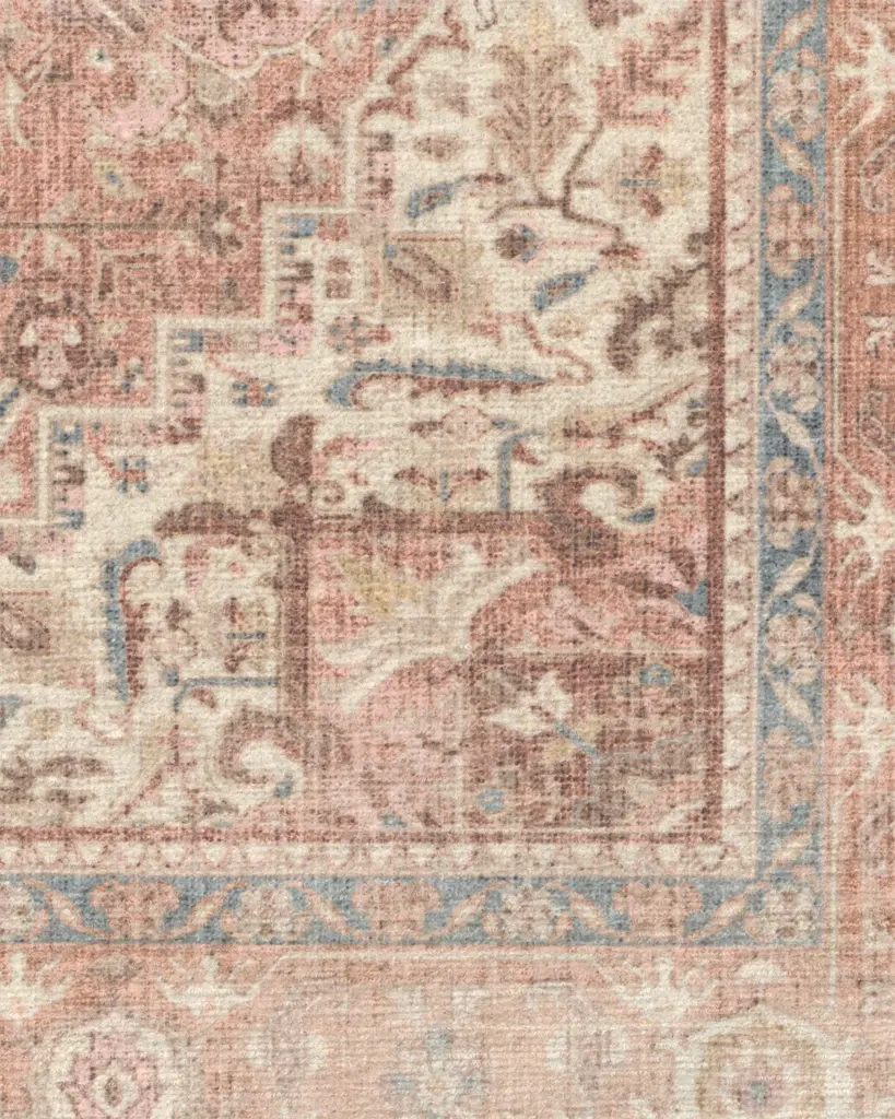 Now blooming. Our rustic Kamran Rose Rug blends a warm blush color palette of nude pink and delightful rose tones with the geometric grandeur of a traditional Heriz design. This Persian-inspired vintage design features a large medallion pattern and ornate border, mixed together with touches of teal, warm taupes, and light corals set atop a golden beige background. Water-resistant, stain-resistant, and machine-washable.
