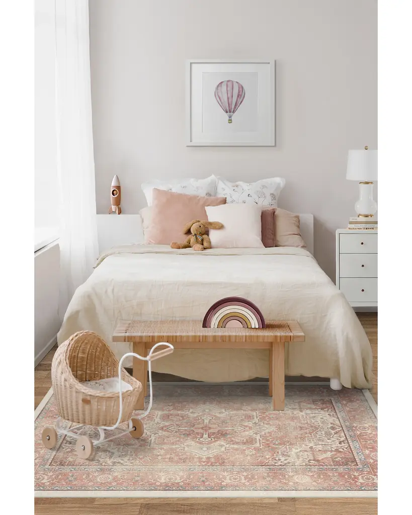 Now blooming. Our rustic Kamran Rose Rug blends a warm blush color palette of nude pink and delightful rose tones with the geometric grandeur of a traditional Heriz design. This Persian-inspired vintage design features a large medallion pattern and ornate border, mixed together with touches of teal, warm taupes, and light corals set atop a golden beige background. Water-resistant, stain-resistant, and machine-washable.