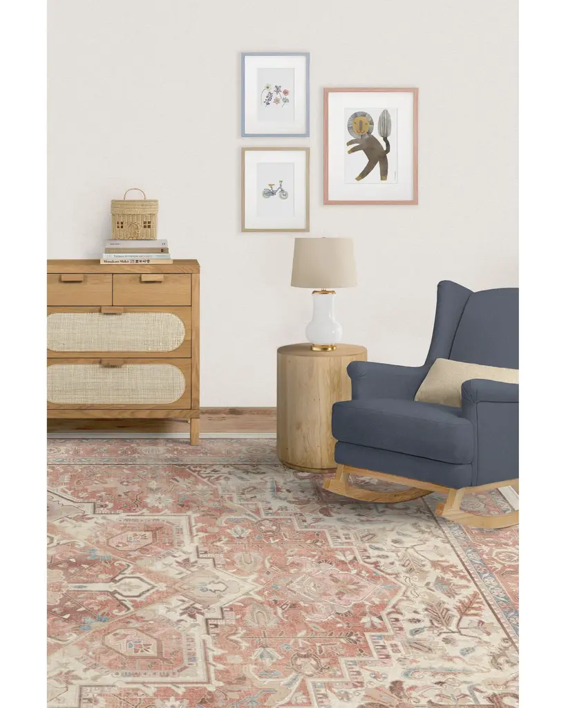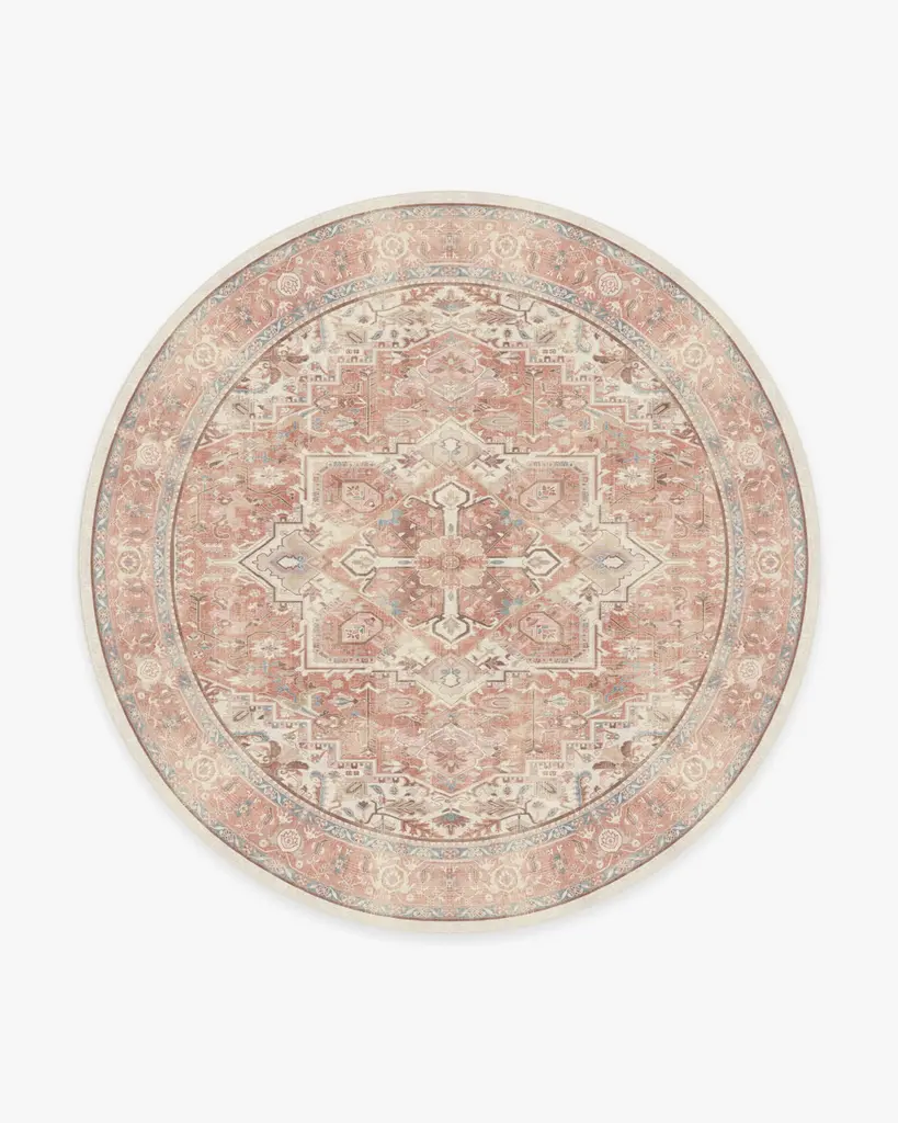 Now blooming. Our rustic Kamran Rose Rug blends a warm blush color palette of nude pink and delightful rose tones with the geometric grandeur of a traditional Heriz design. This Persian-inspired vintage design features a large medallion pattern and ornate border, mixed together with touches of teal, warm taupes, and light corals set atop a golden beige background. Water-resistant, stain-resistant, and machine-washable.