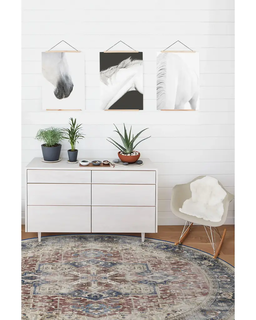 A classic Persian-style design in gorgeous jewel tones. Our Kamran Royal Blue Rug has a distressed, farmhouse look and is distinguished by a large central medallion with an ornate border tinted in burgundy red, space blue, and rich purple. Water-resistant, stain-resistant, and machine-washable.