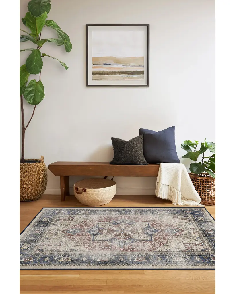 A classic Persian-style design in gorgeous jewel tones. Our Kamran Royal Blue Rug has a distressed, farmhouse look and is distinguished by a large central medallion with an ornate border tinted in burgundy red, space blue, and rich purple. Water-resistant, stain-resistant, and machine-washable.