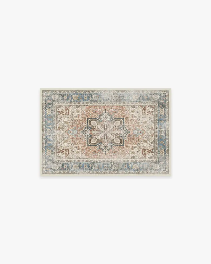 A classic Persian-style design in gorgeous jewel tones. Our Kamran Royal Blue Rug has a distressed, farmhouse look and is distinguished by a large central medallion with an ornate border tinted in burgundy red, space blue, and rich purple. Water-resistant, stain-resistant, and machine-washable.