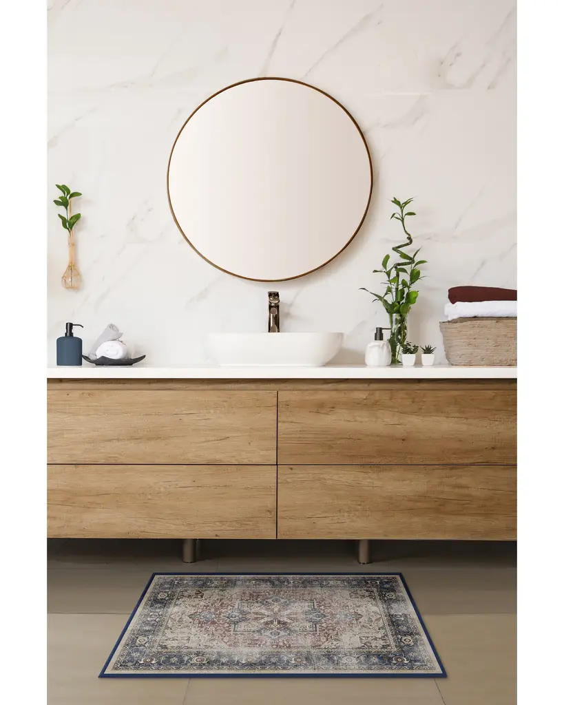 A classic Persian-style design in gorgeous jewel tones. Our Kamran Royal Blue Rug has a distressed, farmhouse look and is distinguished by a large central medallion with an ornate border tinted in burgundy red, space blue, and rich purple. Water-resistant, stain-resistant, and machine-washable.