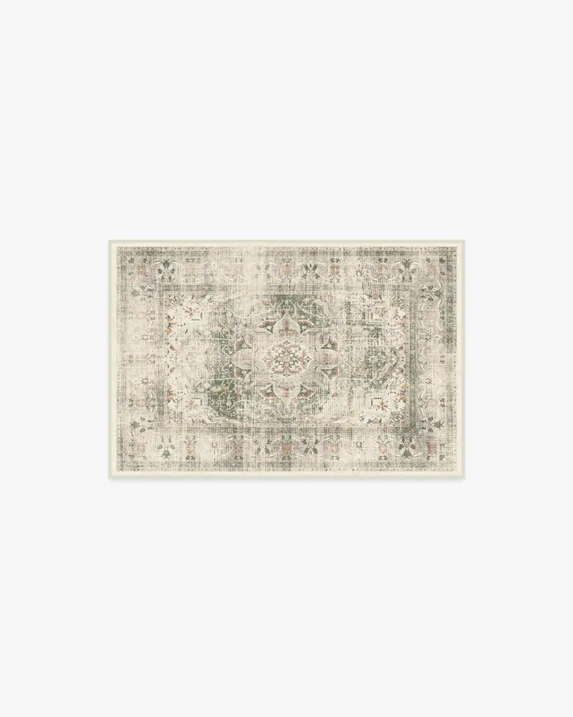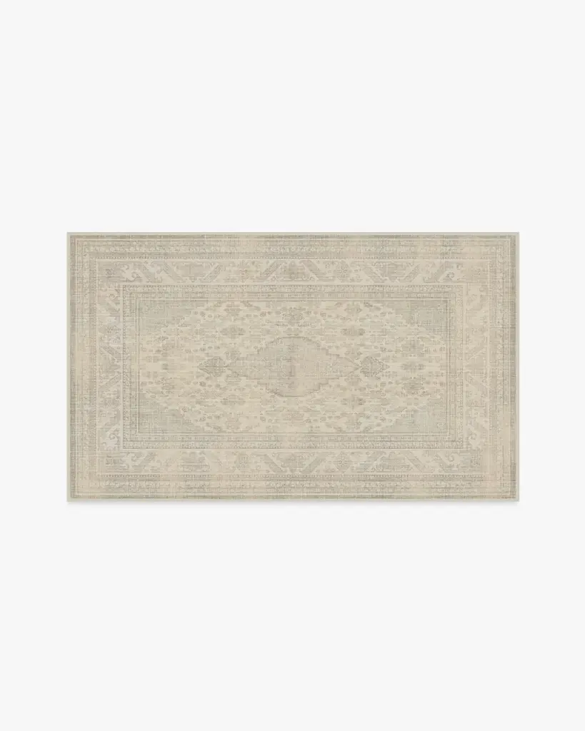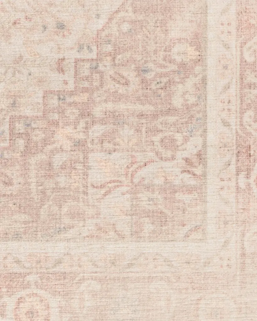 Charming and gentle. Our Kamran Soft Pink Rug brings a light touch of pale pinks tinted with cream and white tones, giving a serene vibe to your space. Set upon an ombre ivory background, and sprinkled with breezy crystal blue accents, this antique-style design features a bold geometric pattern with a large medallion and ornate border. Water-resistant, stain-resistant, and machine-washable.