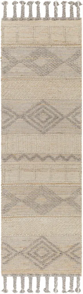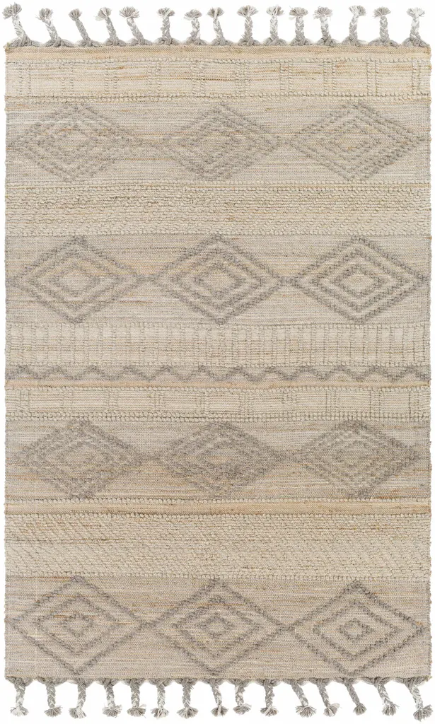 Collection: Kanata Colors: Tan, Gray Construction: Hand Woven Material: 50% Jute,50% Wool Pile: Medium Pile Pile Height: 0.3" Styles: Transitional,Bohemian Made In: India Thickness: 0.4" Fringe Length: 5" Price Range: $$$$$ (Most Affordable)