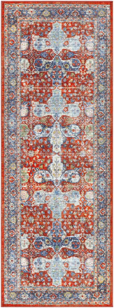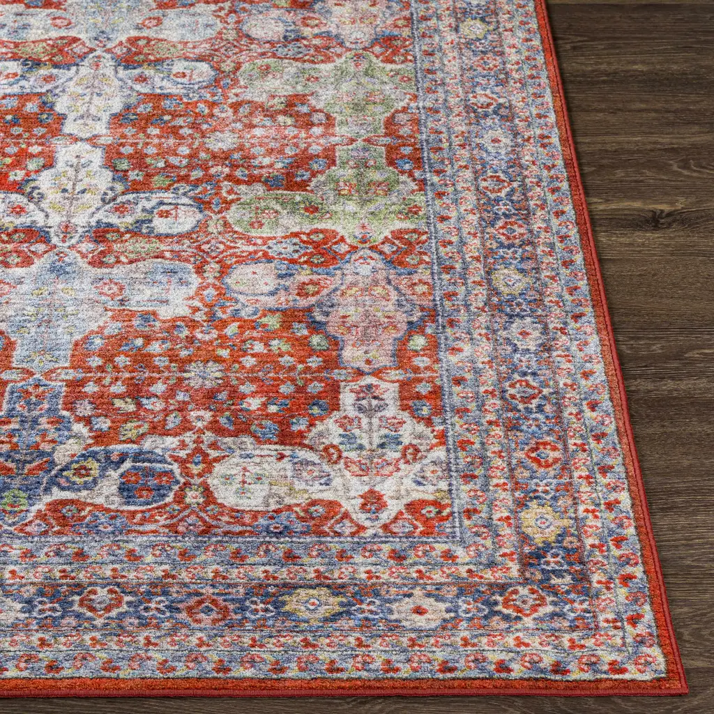 Collection: Kangundo Colors: Blush Pink, Cream, Denim, Red, Sage, Navy Construction: Machine Woven Material: 100% Polyester Pile: Low Pile Pile Height: 0.2" Styles: Traditional Backing: Rubber Machine Washable: Yes Made In: Turkey Thickness: 0.39" Price Range: $$$$$ (Most Affordable)