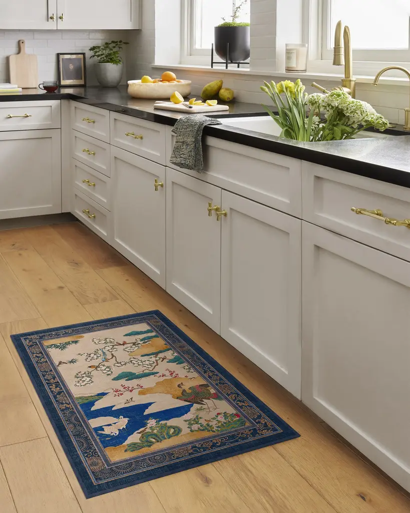 Inspired by an 18th century Japanese screen, our Gracie Kano Garden Multicolor Rug features a handpainted scene of blooming cherry blossoms, golden clouds, and richly-colored birds. The neutral grey background highlights the tonal depth of the design, while the stylized border frames the scene with traditional Japanese artistry. A palette of soft pinks, emerald greens, deep sapphire blues, milky whites, reds, and golds lend a painterly quality. Water-resistant, stain-resistant, and machine-washable. Rug colors may vary slightly according to your device and the lighting in your space.