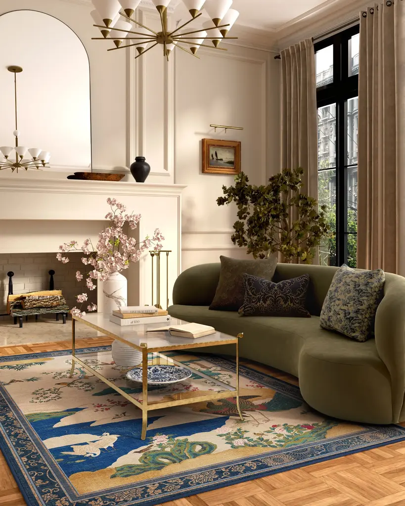 Inspired by an 18th century Japanese screen, our Gracie Kano Garden Multicolor Rug features a handpainted scene of blooming cherry blossoms, golden clouds, and richly-colored birds. The neutral grey background highlights the tonal depth of the design, while the stylized border frames the scene with traditional Japanese artistry. A palette of soft pinks, emerald greens, deep sapphire blues, milky whites, reds, and golds lend a painterly quality. Water-resistant, stain-resistant, and machine-washable. Rug colors may vary slightly according to your device and the lighting in your space.