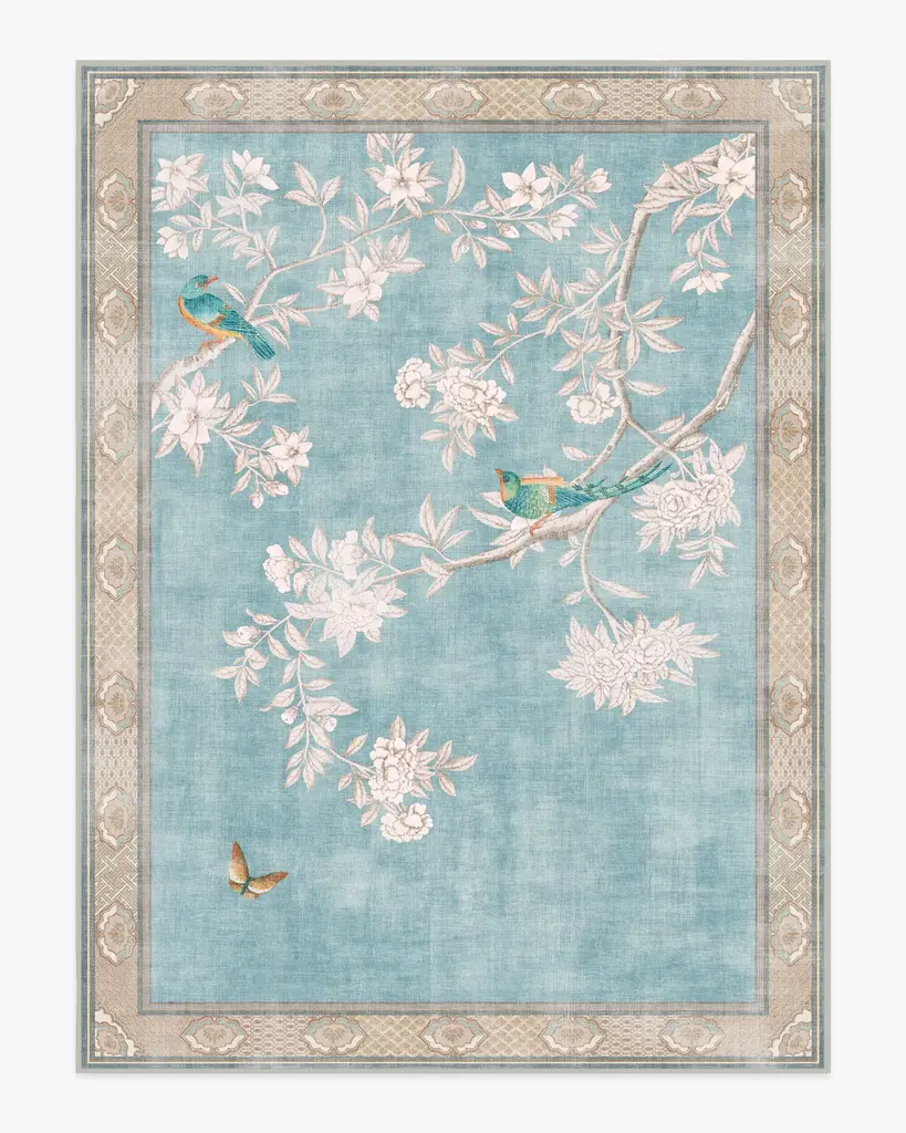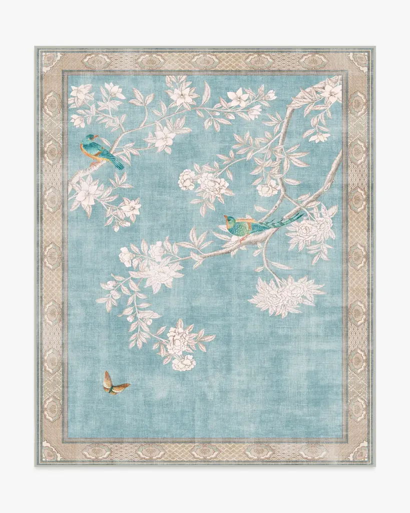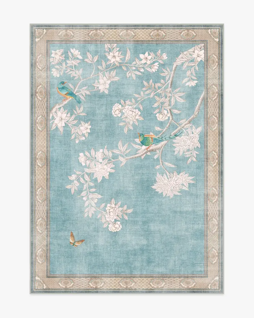 Inspired by an 18th century Japanese screen, our Gracie Kano Garden Multicolor Rug features a handpainted scene of blooming cherry blossoms, golden clouds, and richly-colored birds. The neutral grey background highlights the tonal depth of the design, while the stylized border frames the scene with traditional Japanese artistry. A palette of soft pinks, emerald greens, deep sapphire blues, milky whites, reds, and golds lend a painterly quality. Water-resistant, stain-resistant, and machine-washable. Rug colors may vary slightly according to your device and the lighting in your space.