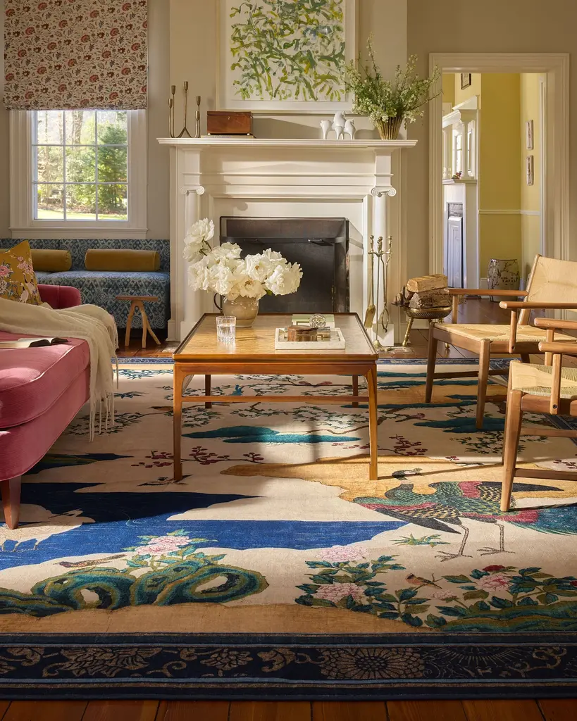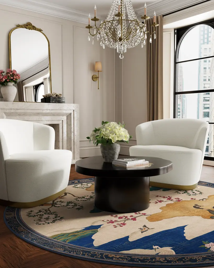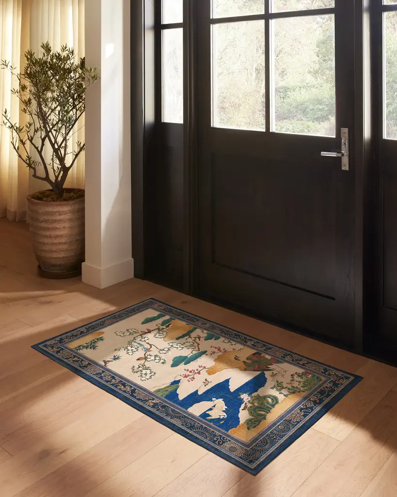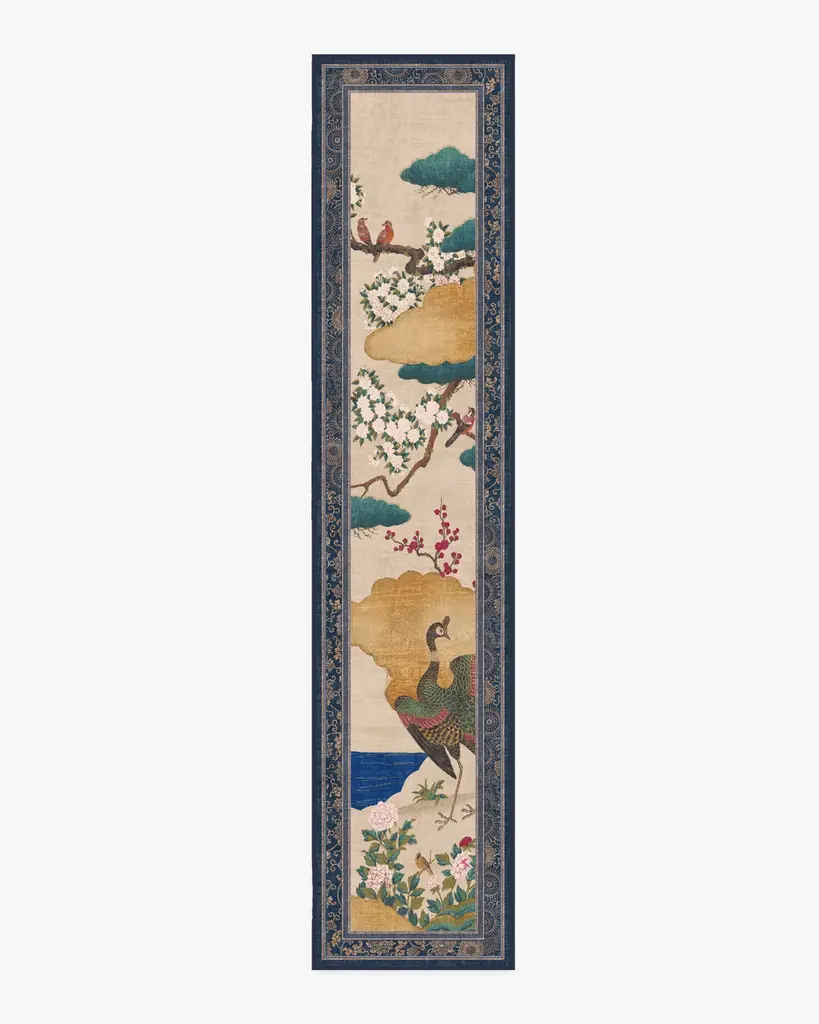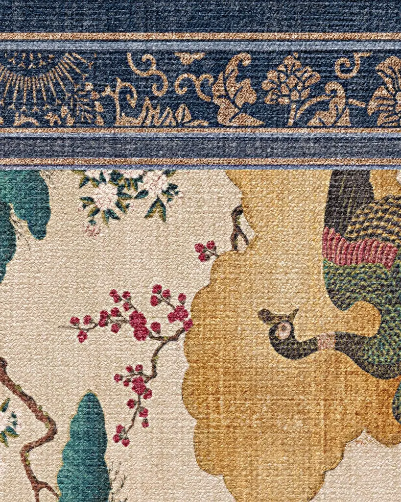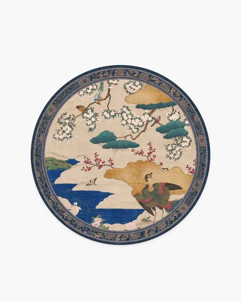 Inspired by an 18th century Japanese screen, our Gracie Kano Garden Multicolor Rug features a handpainted scene of blooming cherry blossoms, golden clouds, and richly-colored birds. The neutral grey background highlights the tonal depth of the design, while the stylized border frames the scene with traditional Japanese artistry. A palette of soft pinks, emerald greens, deep sapphire blues, milky whites, reds, and golds lend a painterly quality. Water-resistant, stain-resistant, and machine-washable. Rug colors may vary slightly according to your device and the lighting in your space.