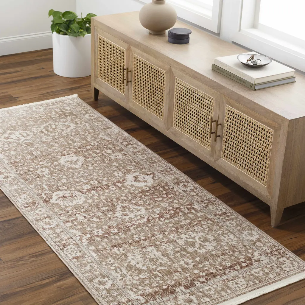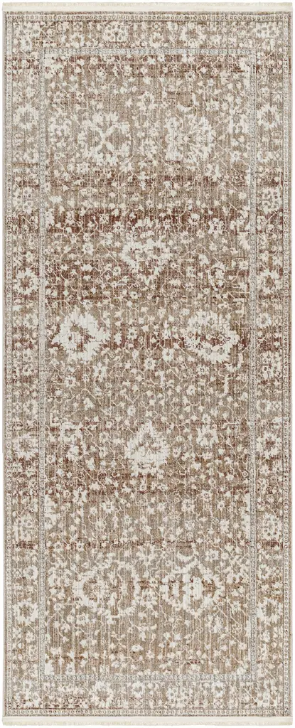 Collection: Kaongkod Colors: Ivory, Olive, Sage, Dusty Pink, Pale Blue, Medium Brown Construction: Machine Woven Material: 100% Polyester Pile: Medium Pile Pile Height: 0.22" Styles: Traditional Made In: Turkey Thickness: 0.41" Fringe Length: 0.1" Price Range: $$$$$ (Most Affordable)