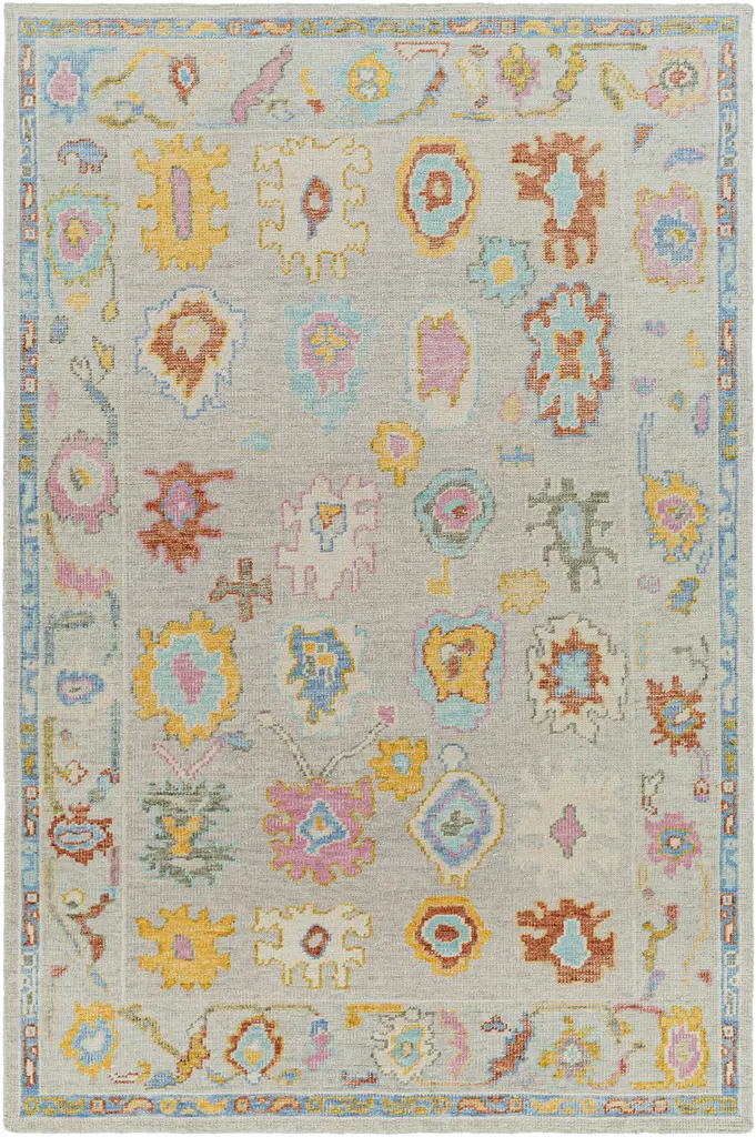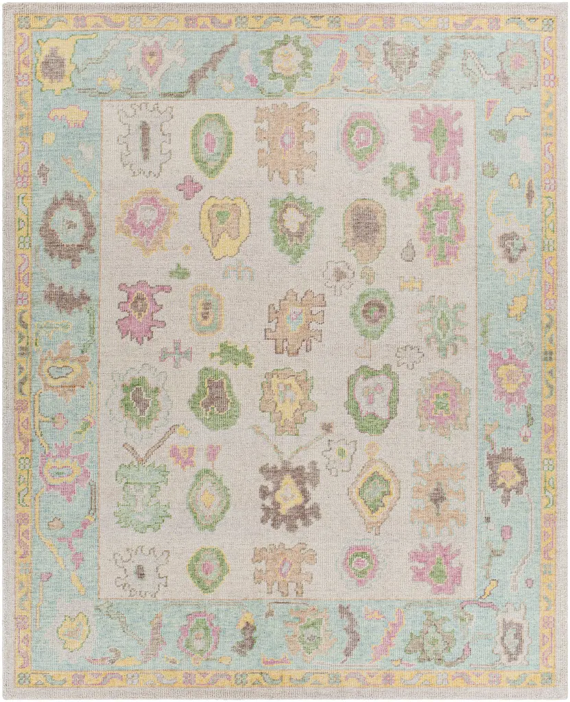 Collection: Kapaya Colors: Aqua, Blue, Yellow, Light Pink, Rust, Grass Green Construction: Hand Knotted Material: 80% Wool,20% Cotton Pile: Low Pile Pile Height: 0.19" Styles: Traditional Made In: India Thickness: 0.39" Price Range: $$$$$ (Premium)