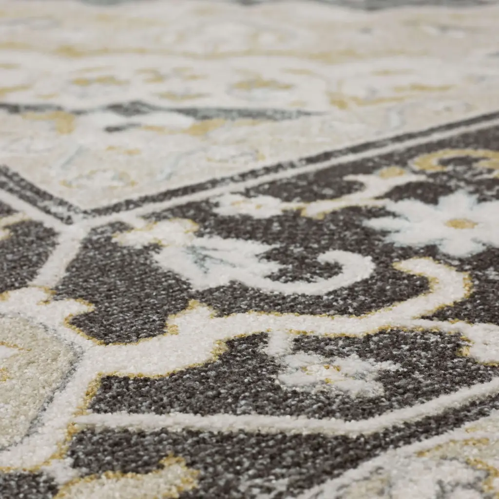 Collection: Edenhall Colors: Charcoal, Silver Gray, Gold, Ivory Construction: Machine Woven Material: Face: 87% Polyester/13% Polypropylene / Warp: 100% Latex Pile: Medium Pile Pile Height: 0.35" Styles: Transitional Backing: Latex Made In: Turkey Thickness: 0.35" Price Range: $$$$$ (Affordable)