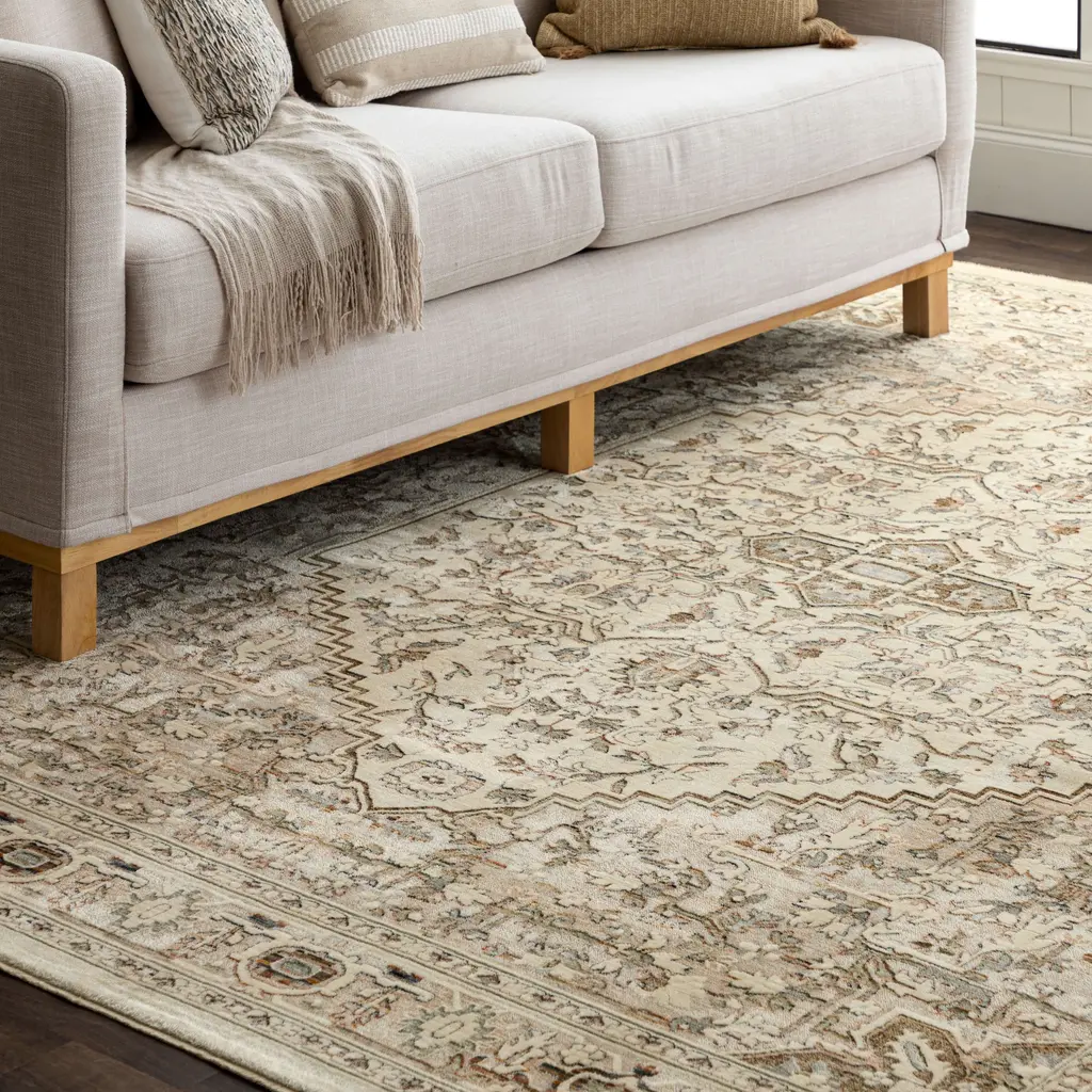 Traditional designs are the hallmark of Karastan's Divina Collection. Sumptuous polyester fiber with a burnished sheen is displayed in soft, neutral colors in a carved effect high/low pile. The rugs of the Divina Collection are available in dreamy shades of cream, light blue, grey and bring a touch of elegance to any room. STYLISH DESIGN: This trendsetting ornamental area rug design in a versatile color palette can be seamlessly integrated into a variety of home décor styles. DURABLE MATERIALS: Machine woven premium polyester surface fiber with clearcoat spray latex backing offers superior strength stain resistance, fade-resistant color clarity, and fixed shape under daily use. LOW PILE: Low-profile pile height offers ideal functionality for any busy space by helping reduce tripping hazards and entryway obstructions as it won't stop doors from opening or closing. EASY CARE AND CLEAN: Simply vacuum regularly, spot clean with a solution of mild detergent and water, or clean professionally when needed. IMPORTED FROM TURKEY: Karastan Rugs has partnerships with top vendors from around the globe to provide the best décor solutions for your home.
