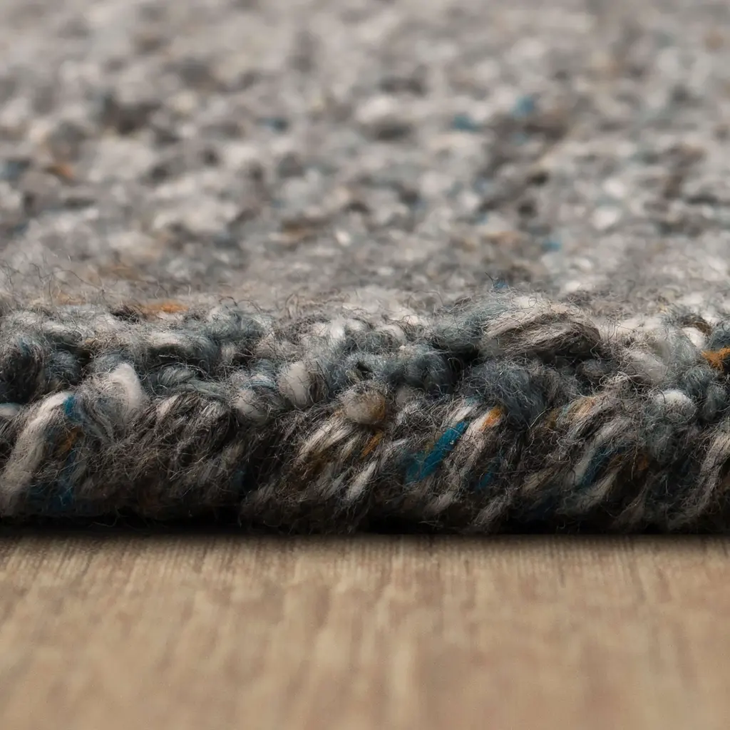 Collection: Haberdasher Colors: Gray, Silver Gray, Graphite, Gun Metal Gray, Dim Gray, Majolica Blue, Antique White, Rust Construction: Hand Tufted Material: Face: 53%Polyester/47%Wool / Warp: 100% Canvas Pile: Medium Pile Pile Height: 0.21" Styles: Casual Backing: Canvas Made In: India Thickness: 0.21" Price Range: $$$$$ (Premium)