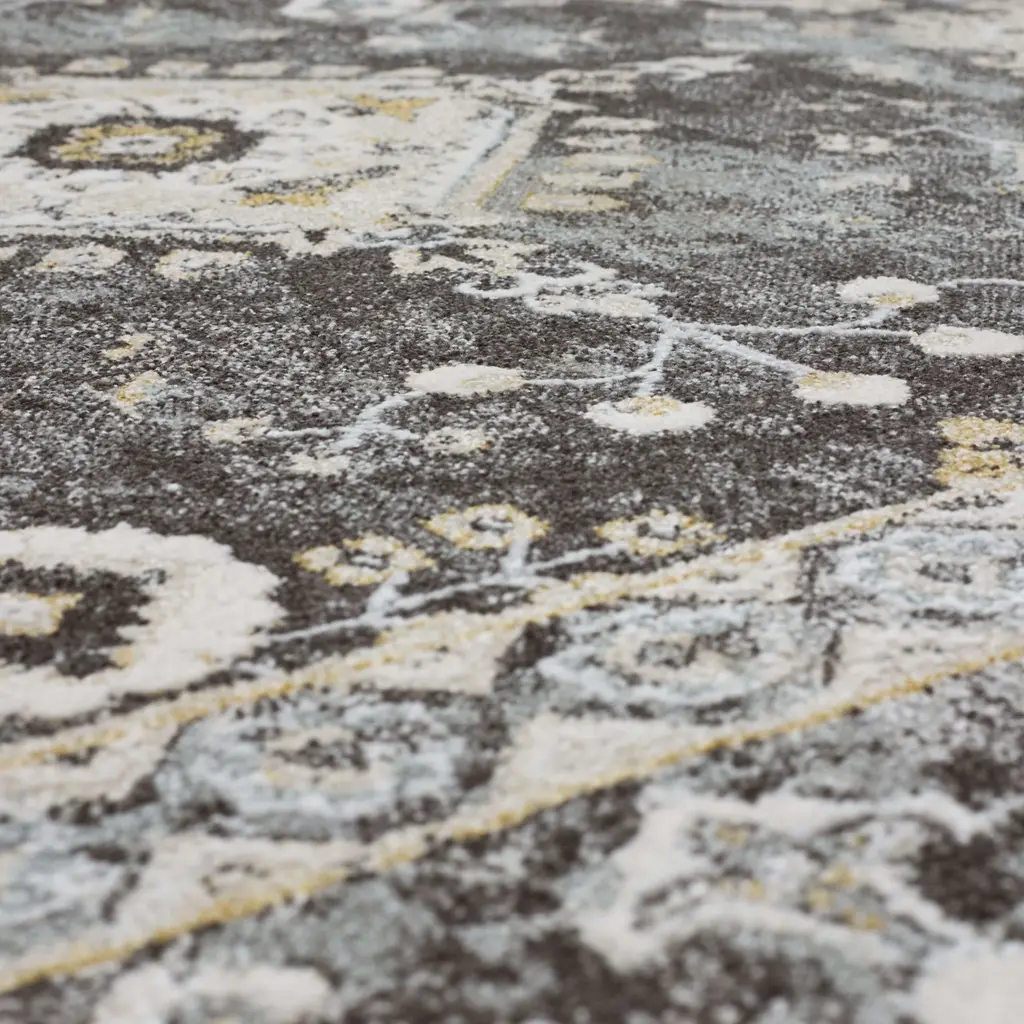 Collection: Ravenglass Colors: Graphite, Cream, Gold, Pale Blue Construction: Machine Woven Material: Face: 92% Polyester/8% Polypropylene / Warp: 100% Latex Pile: Medium Pile Pile Height: 0.35" Styles: Traditional Backing: Latex Made In: Turkey Thickness: 0.35" Price Range: $$$$$ (Affordable)