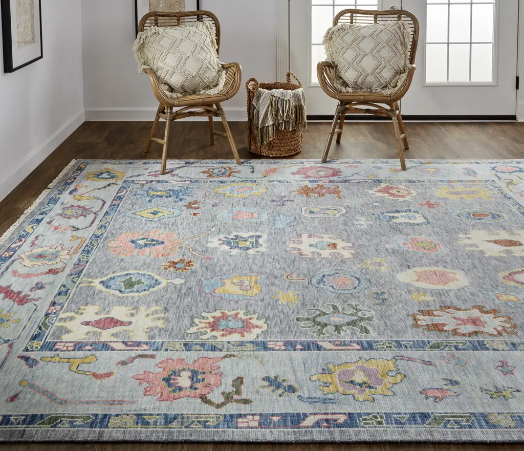 Collection: Karina Colors: Blue, Gray, Red Construction: Hand Knotted Material: Face: 100%Wool / Warp: Cotton Pile: Low Pile Pile Height: 0.2" Styles: Traditional,Persian,Craftsman Backing: Cotton Made In: India Thickness: 0.2" Price Range: $$$$$ (Premium)