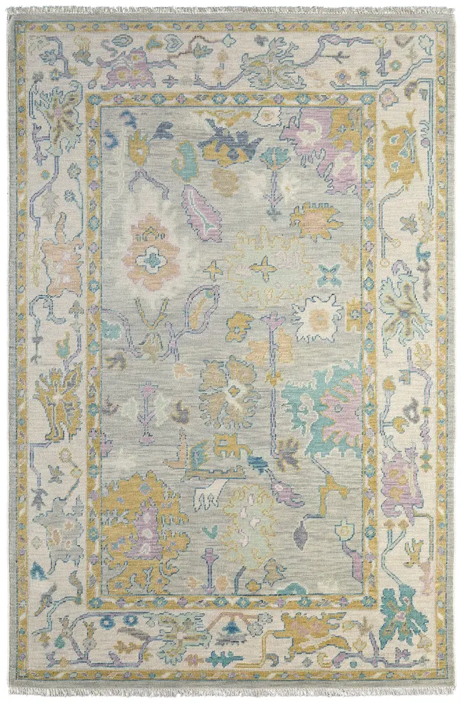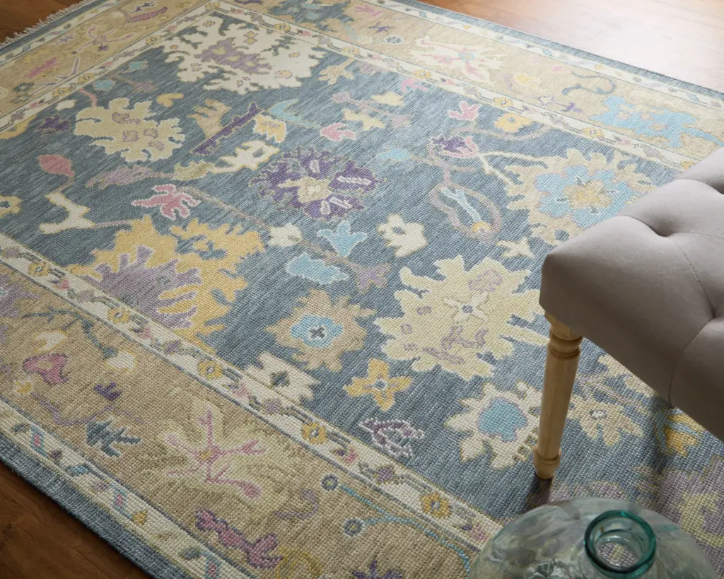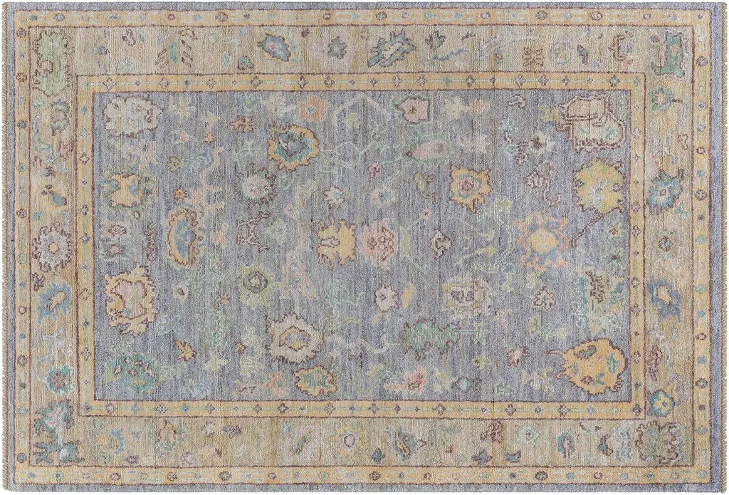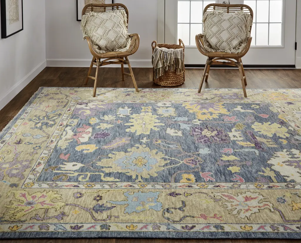 Collection: Karina Colors: Gold, Blue, Purple Construction: Hand Knotted Material: Face: 100%Wool / Warp: Cotton Pile: Low Pile Pile Height: 0.2" Styles: Traditional,Bohemian & Eclectic,Craftsman Backing: Cotton Made In: India Thickness: 0.2" Price Range: $$$$$ (Premium)