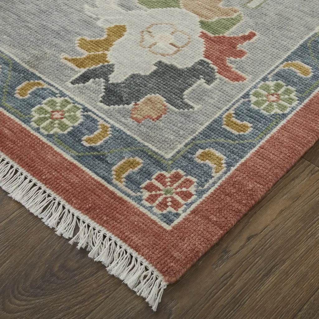 Collection: Karina Colors: Red, Gray, Ivory Construction: Hand Knotted Material: Face: 100%Wool / Warp: Cotton Pile: Low Pile Pile Height: 0.2" Styles: Transitional,Bohemian & Eclectic,Craftsman Backing: Cotton Made In: India Thickness: 0.2" Price Range: $$$$$ (Premium)