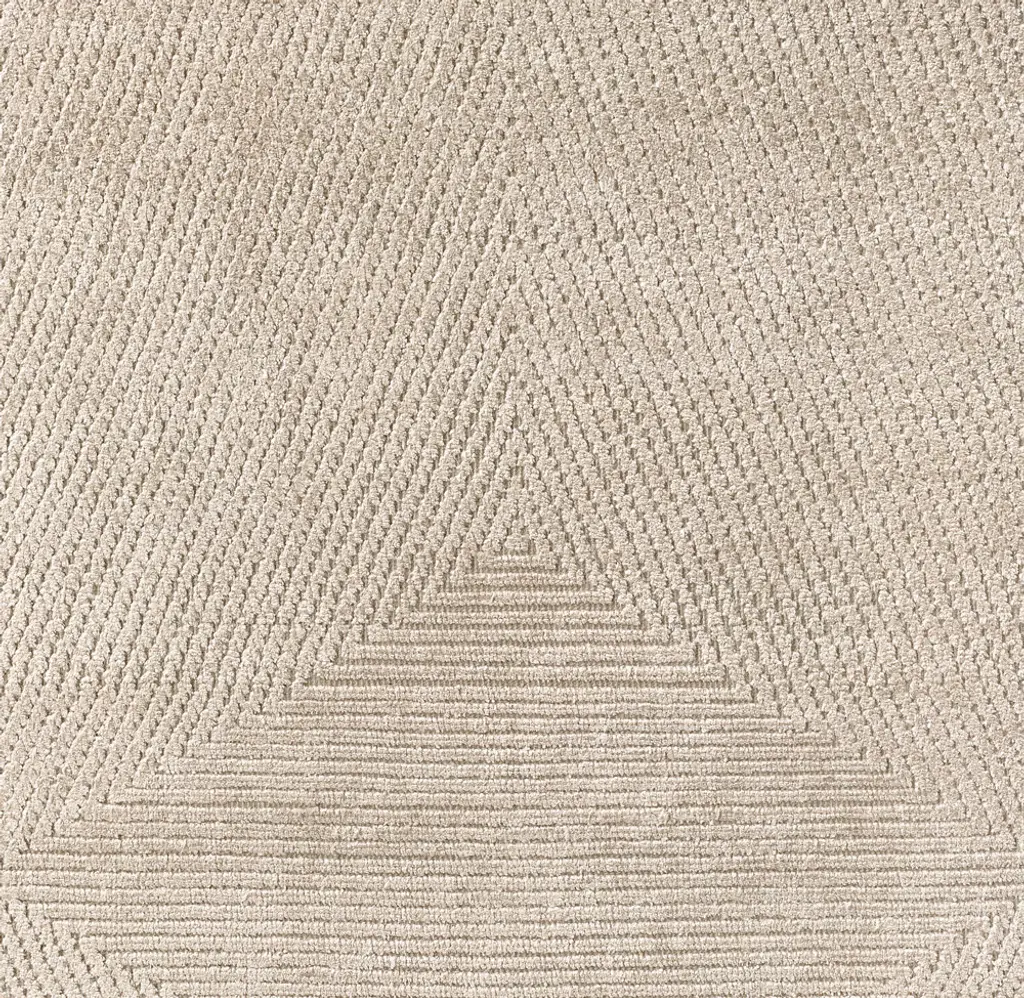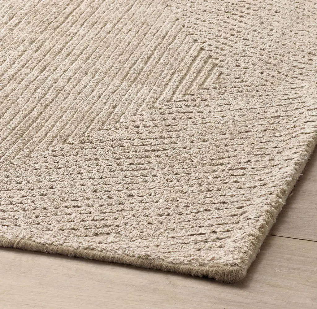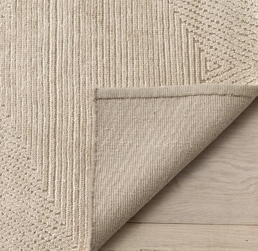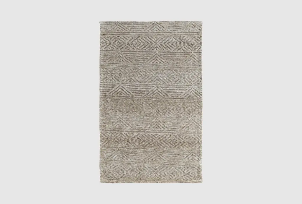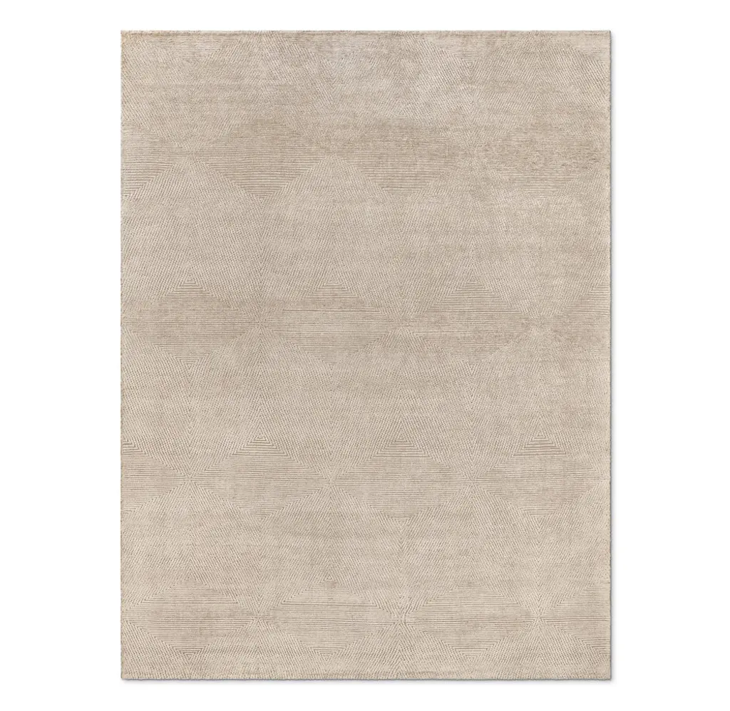 Kaveri's artful geometry gains dimension from rows of luxuriant silk and smooth, flatwoven wool. Knotted by hand, the precise lines are softened by organic variations in the shading and texture of the soft pile.