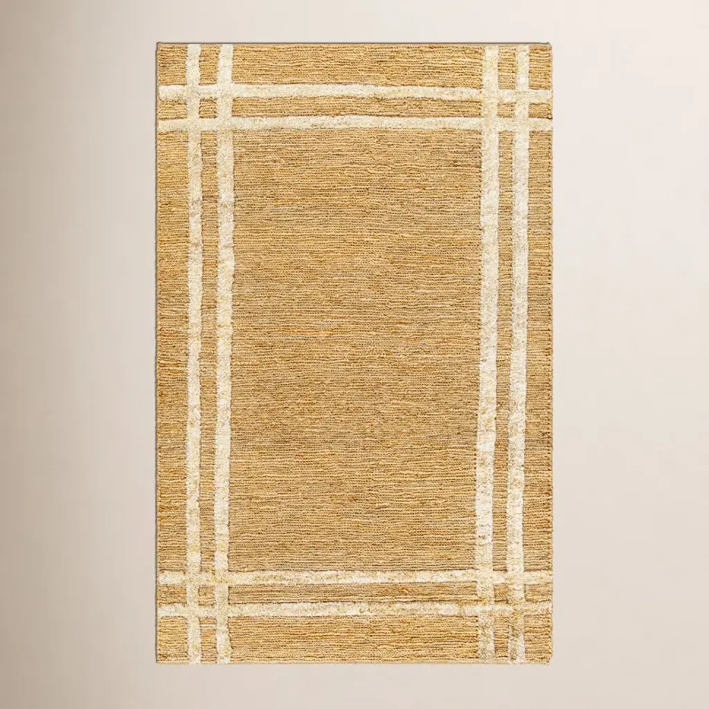 Collection: Kazu Colors: Tan, Dark Brown, Medium Brown, Off White Construction: Hand Woven Material: 100% Jute Pile: High Pile Pile Height: 0.79" Styles: Transitional,Bohemian Made In: India Thickness: 0.98" Price Range: $$$$$ (Affordable)