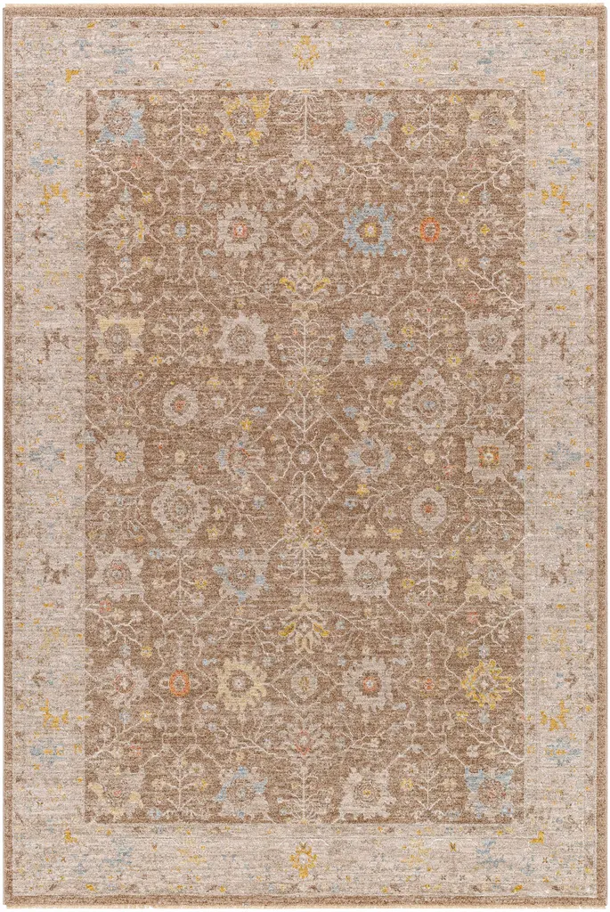 Collection: Keao Colors: Taupe, Mustard, DarkBrown, MediumGray Construction: Machine Woven Material: 100% Polyester Pile: Medium Pile Pile Height: 0.31" Styles: Traditional Made In: Turkey Thickness: 0.35" Fringe Length: 0.4" Price Range: $$$$$ (Affordable)
