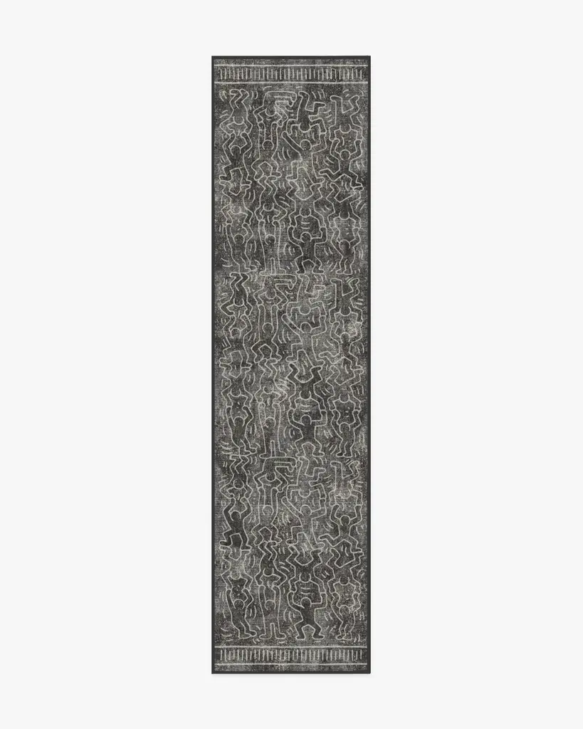 A classic trellis gets the Keith Haring treatment. Our Keith Haring Balancing Act Black Rug features Haring's figures stacked on top of each other to form this fun, repeating pattern. The soft black background with lighter accents of grey and white gives this high-contrast design a textured look. Water-resistant, stain-resistant, and machine-washable.