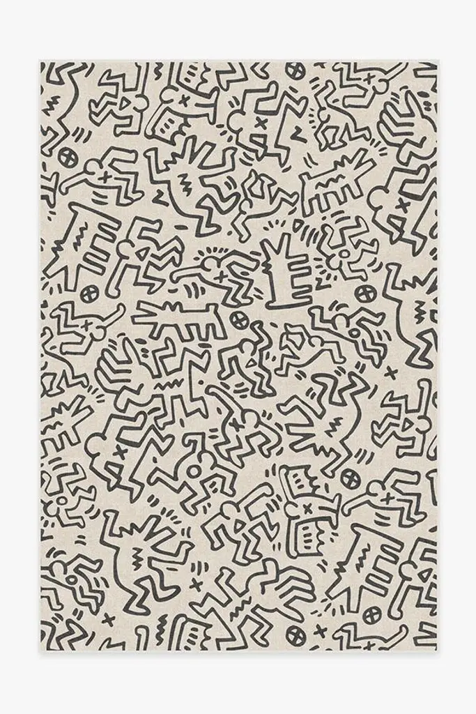 An artsy piece that needs no introduction. With a versatile, minimal colorway, our Keith Haring Block Party Black and Ivory Rug brings iconic Keith Haring art to your floor in a simple yet striking way. Water-resistant, stain-resistant, and machine-washable.