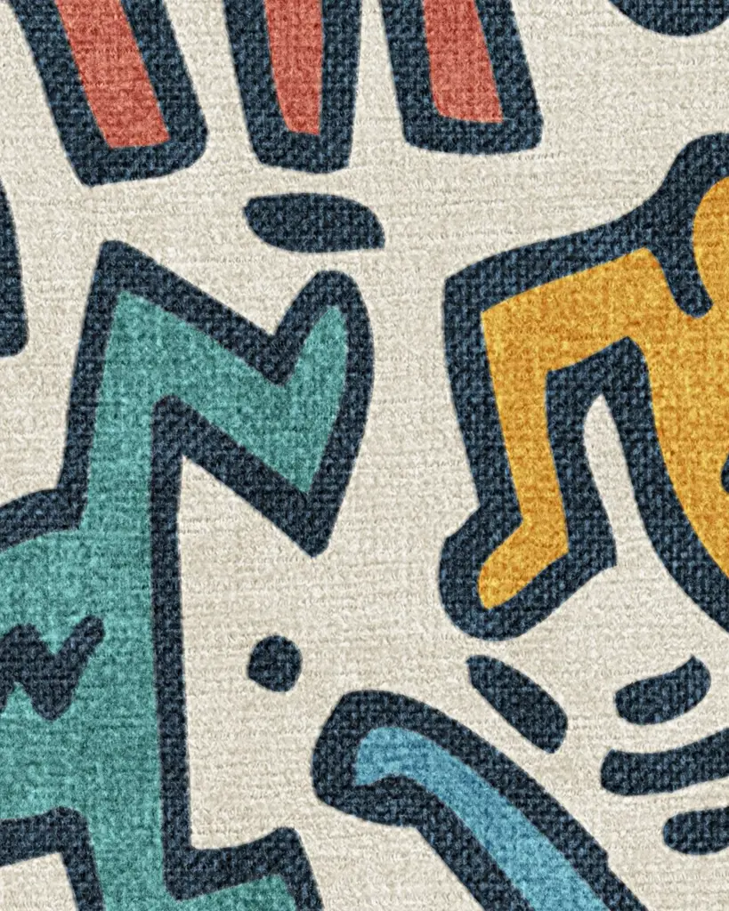 A colorful and artistic design. The bright palette of our Keith Haring Block Party Multicolor Rug matches the level of high-energy movement that Haring's work embodies. This is accomplished with vivid yellow, turquoise, navy blue, brick red, and dark aqua blue on an ivory background. Water-resistant, stain-resistant, and machine-washable.