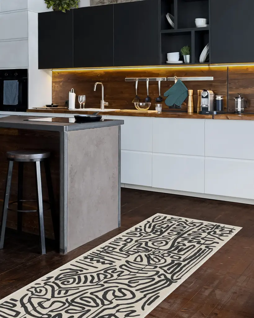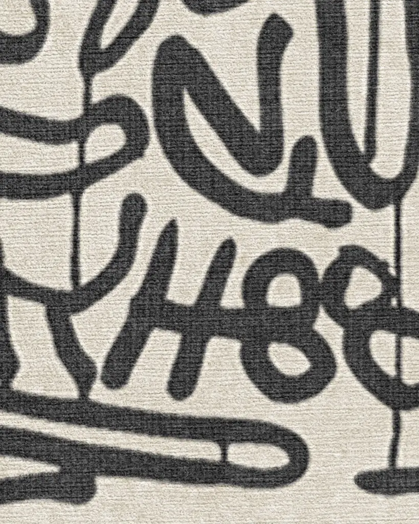 Edgy and modern. Our Keith Haring Freestyle Black and Ivory Rug features a single-line design of dark grey on an off-white background and is sure to catch the eye anywhere it's placed. Water-resistant, stain-resistant, and machine-washable.