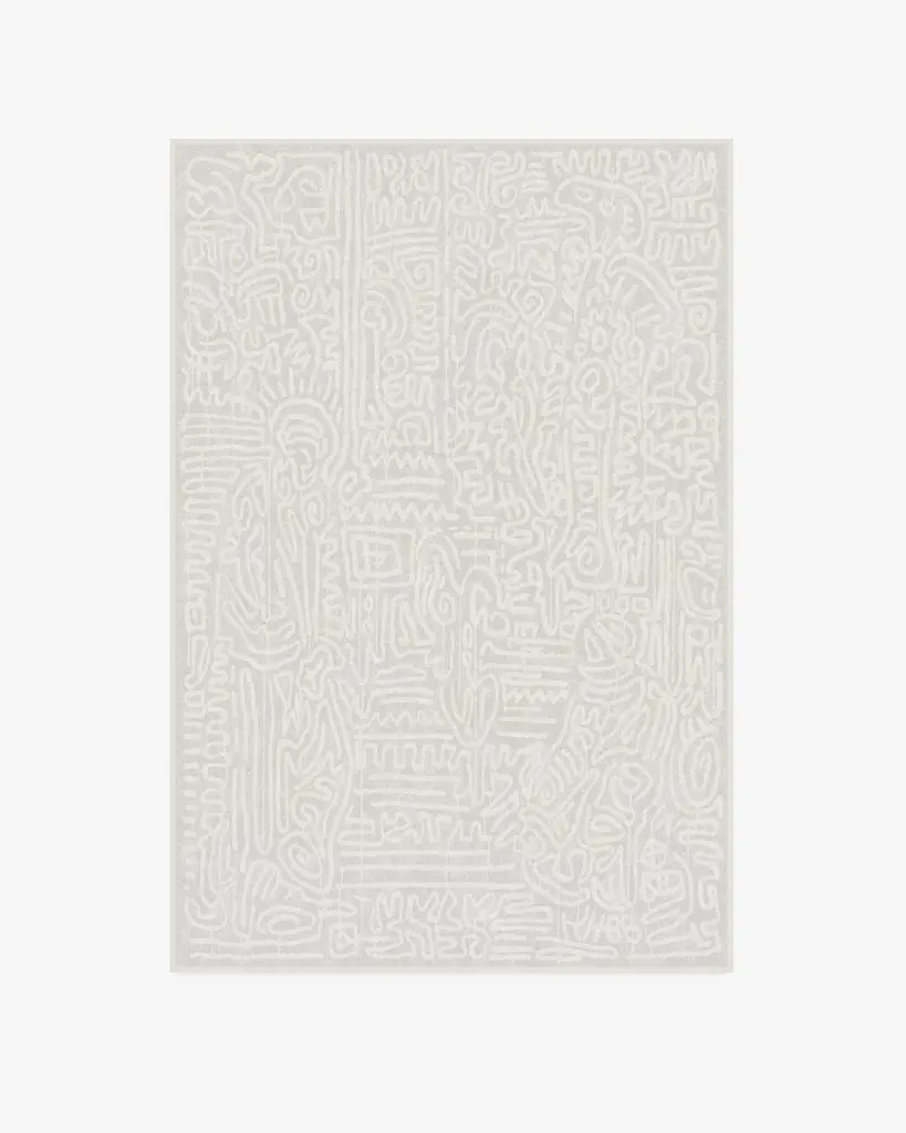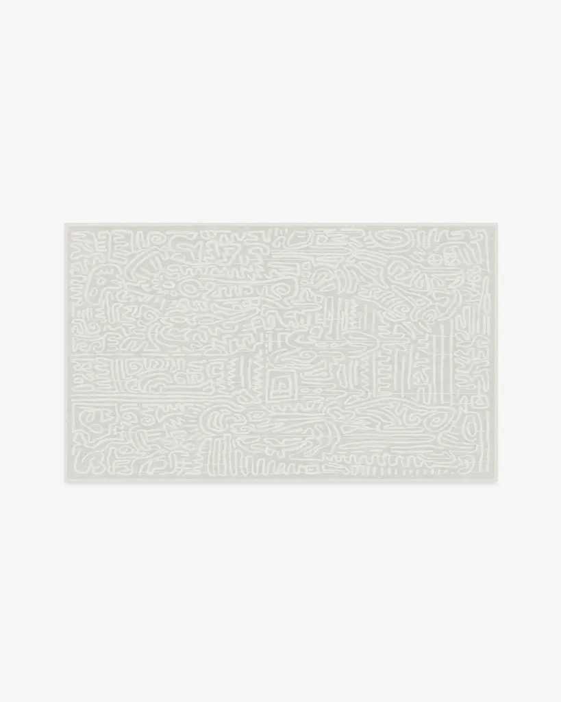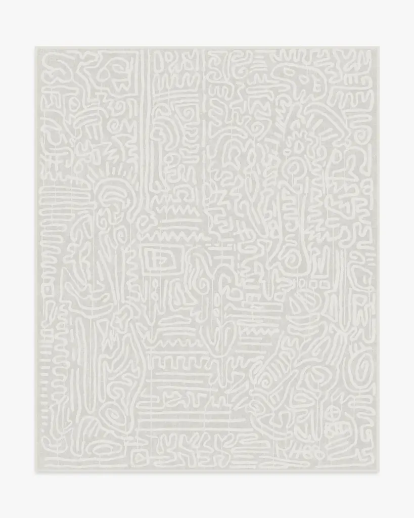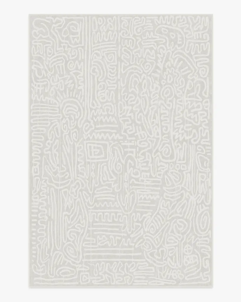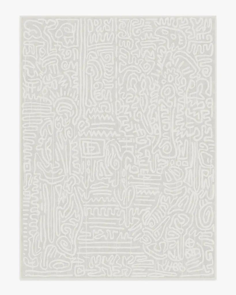 Freestyle fine art for your home. Our ornate Keith Haring Freestyle Pearl Rug features a single line design by the artist in off-white on a sandy pearl background for a subtle yet striking balance. Water-resistant, stain-resistant, and machine-washable.