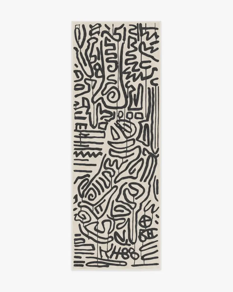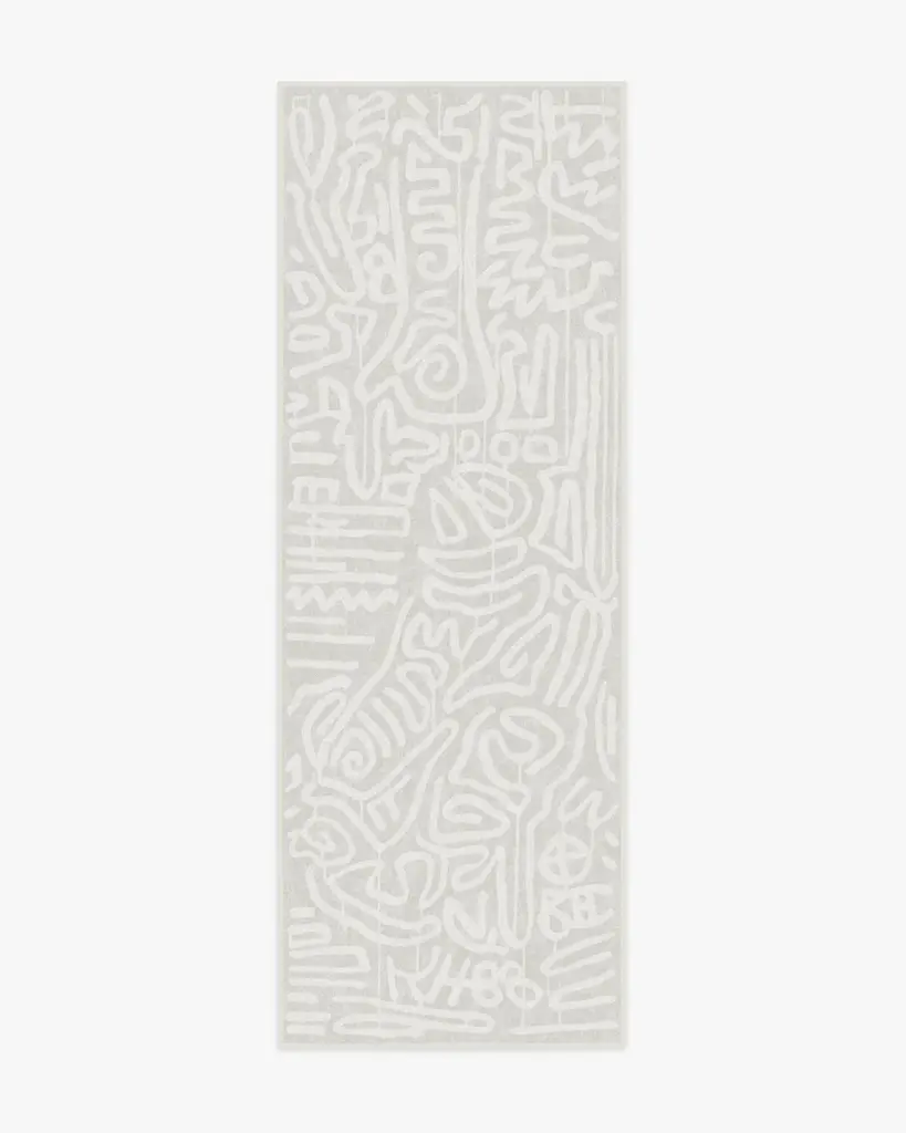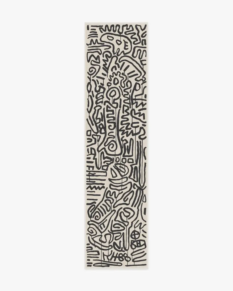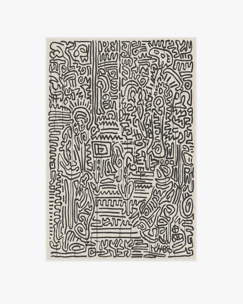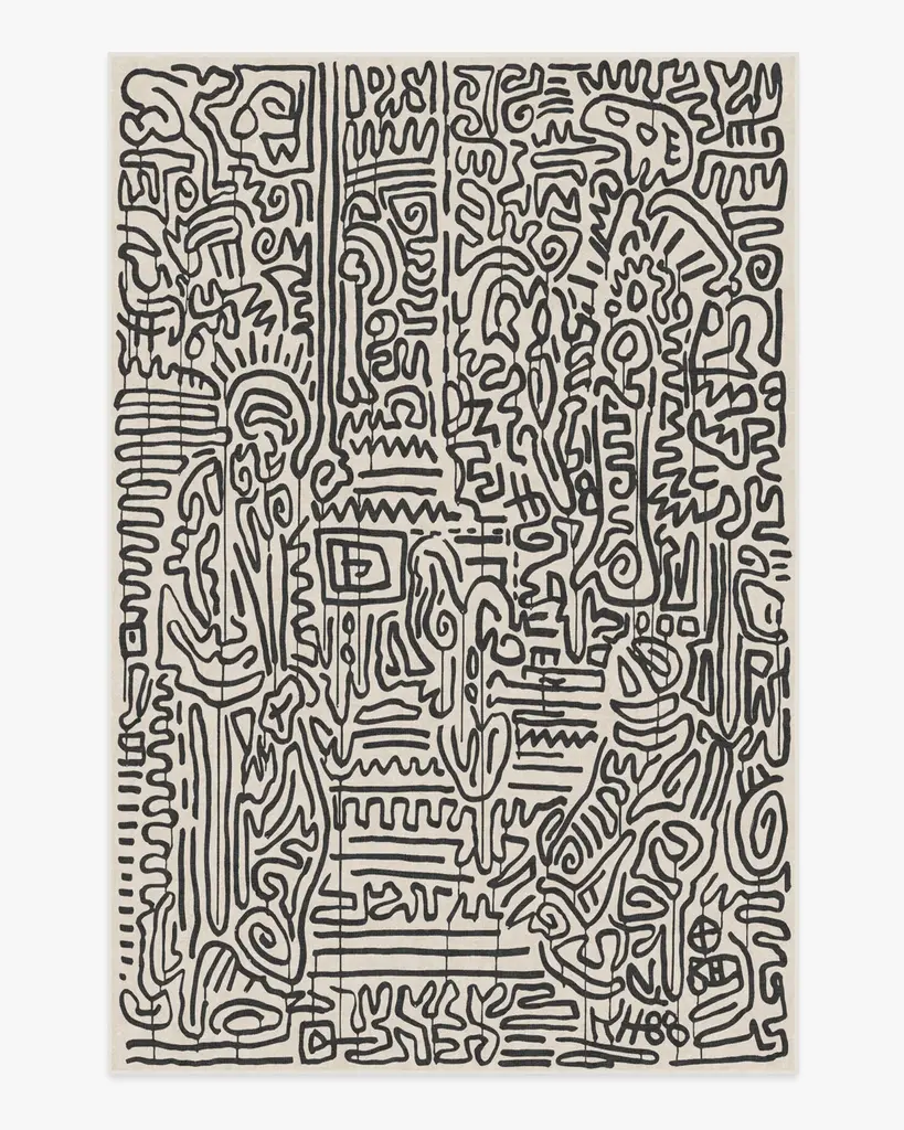 Freestyle fine art for your home. Our ornate Keith Haring Freestyle Pearl Rug features a single line design by the artist in off-white on a sandy pearl background for a subtle yet striking balance. Water-resistant, stain-resistant, and machine-washable.