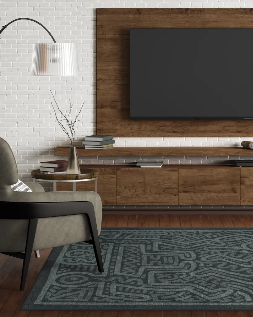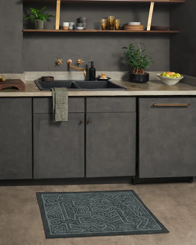 Stunning and evocative. With tones of deep spruce green that offer a textural look, our Keith Haring Funny Gallery Spruce Green Rug is a bold, artistic choice for any room. Water-resistant, stain-resistant, and machine-washable.
