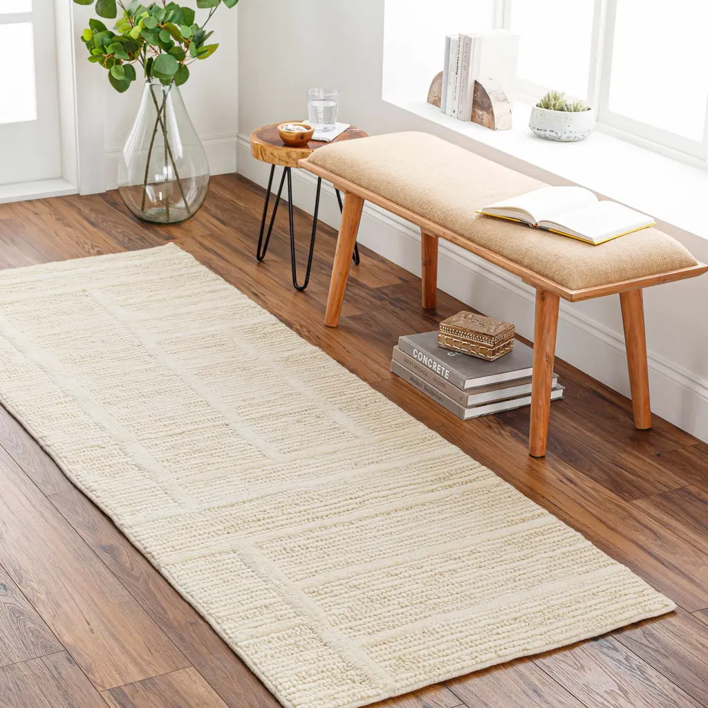 Collection: Kelburn Colors: Gray, Light Slate Construction: Hand Woven Material: 100% NZ Wool Pile: Medium Pile Pile Height: 0.47" Styles: Contemporary Made In: India Thickness: 0.59" Price Range: $$$$$ (Premium)