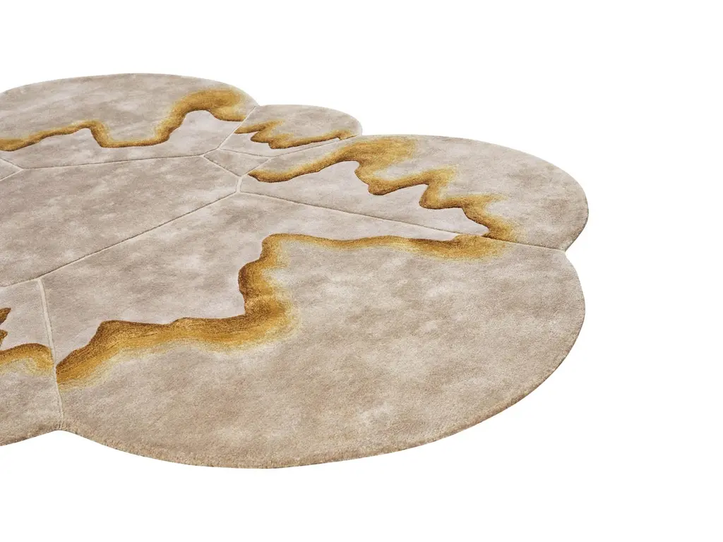 Volcano is a flame of life. Like humans, fire is one of the livings, an organic life. It is conceived, needs sustenance and oxygen, it ages and succumbs. The physical attribute of a volcano and its formation is replicated in the design of the carpet. In abstraction, it is seen in a round shape that makes a powerful movement to ingrain the expectation of something past the structure. The flame once lit encourages everything inside its circle. The carpet symbolizes the sphere filled with flaming fire of a volcano.Available in color ivory gold in size 180 cm x 205 cm.