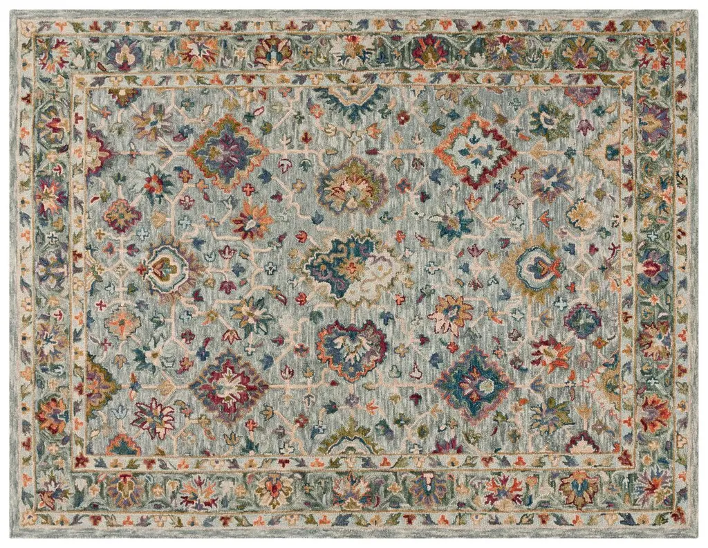 Elevate your living space with the exquisite charm of our Bohemian-style area rug, sized at a generous 10' X 14'. This large rectangle rug is a masterpiece of craftsmanship, featuring a hand-tufted construction that combines 85% luxurious wool and 15% cotton, creating a plush 1/2" pile height that promises comfort and durability. The fusion of grey and green hues forms a harmonious backdrop for the intricate pattern observed in the image, showcasing traditional motifs that evoke an antique allure while bursting with contemporary color accents. Each rug is meticulously made in India, ensuring a level of authenticity and quality that is unmatched. Infuse your home with the timeless elegance and modern flair of this beautiful wool-cotton blend rug, a true statement piece that effortlessly enhances any decor.